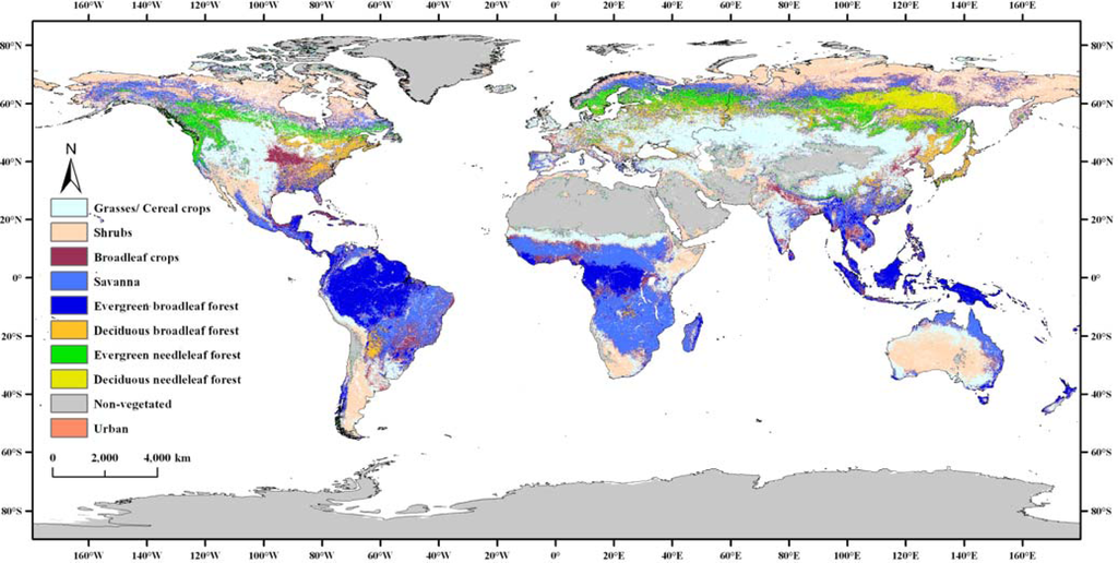 MODIS global land cover products are generated utilizing a supervised classification method that exploits a global training database obtained from high-resolution imagery in association with ancillary data []. The classification algorithm requires spectral and temporal information from MODIS nadir BRDF-adjusted reflectance (NBAR) bands 1–7, supplemented by the enhanced vegetation index (EVI), and the MODIS land surface temperature (LST) is required to obtain the land cover types and phenology information. Several classification schemes are adopted, principally, the International Geosphere Biosphere Program (IGBP) (Type 1), the University of Maryland (UMD) (Type 2) and LAI/FAPR biomes (Type 3). In the IGBP classification scheme, in addition to the primary types, an alternative secondary type was assigned for each pixel when the confidence in the primary type is not high []. Pixels with no secondary label were considered unequivocal with high confidence []. The paired primary and secondary land cover types make it possible to study the potential LAI uncertainty caused by biome misclassification. In this study, ‘misclassification’ represents both subpixel mixture and biome misclassification.