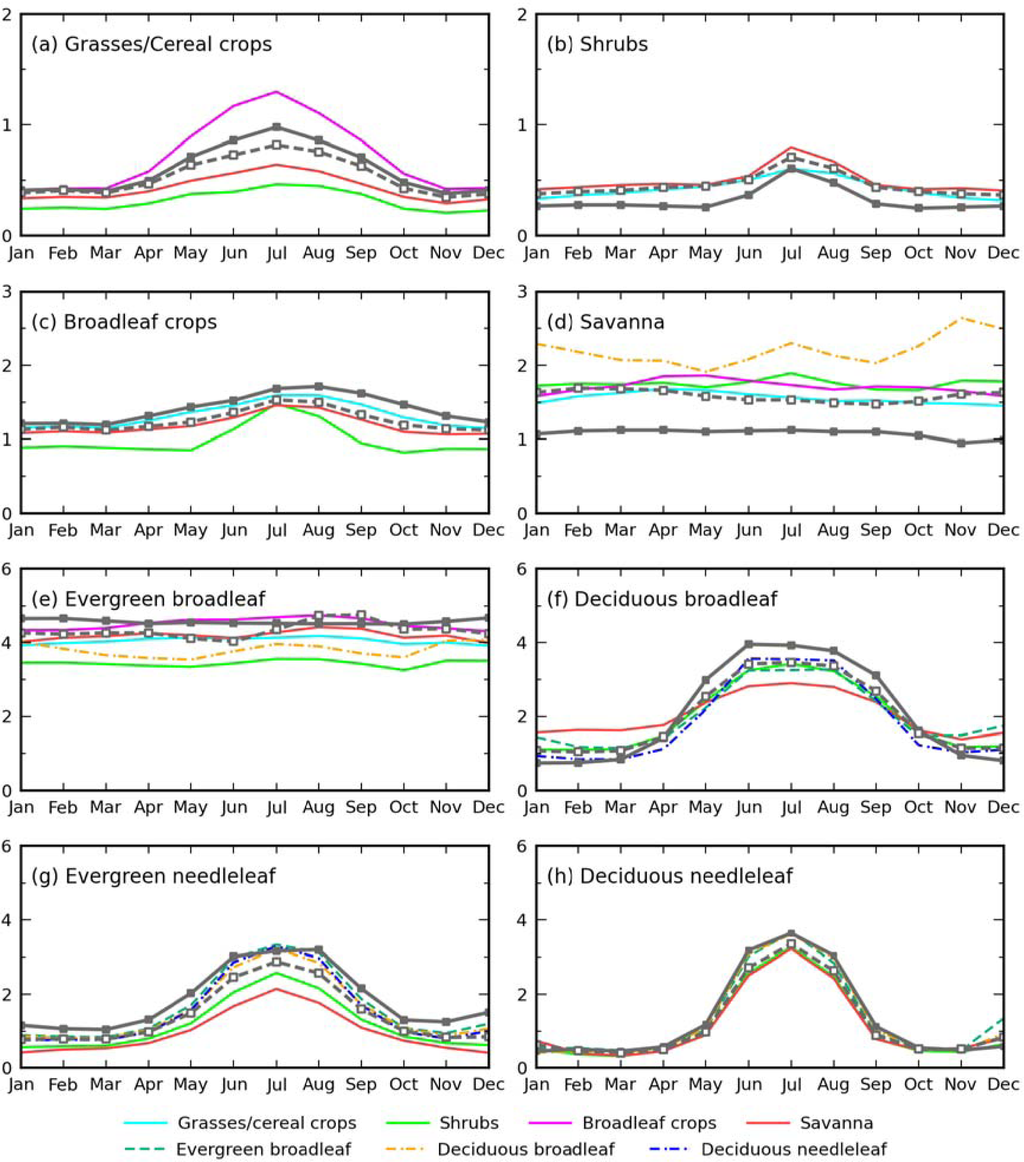LAI values for evergreen broadleaf forest are greatly underestimated when misclassified as any other type, reaching by about 1.25 (−27.8%) in October when misclassified as shrubs. Misclassification of deciduous broadleaf forest as savanna lowers the estimated LAI in summer by about 1.14 (−28.9%). Misclassification of deciduous broadleaf forest as evergreen broadleaf forest increases the LAI by about 0.94 (116.0%) in winter. The underestimation of LAI for evergreen needleleaf forest is up to 1.43 (−44.7%) in August. For deciduous needleleaf forest, misclassification generally leads to an underestimation in summer (0.68 or −21.4%), but an overestimation in winter (0.77 or 132.8%).