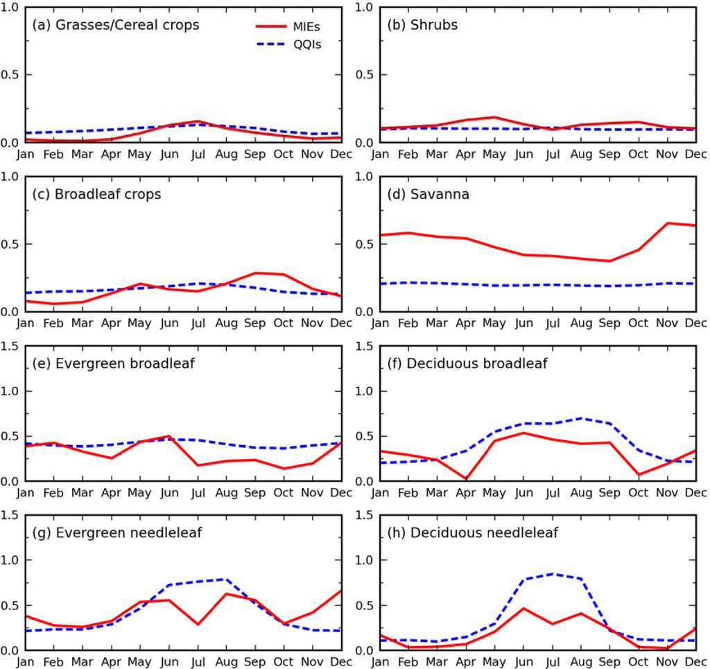 To acquire a better understanding of both quality indicators, the uncertainties induced by misclassification are compared with those reported in QQIs (Figure 4). QQIs mainly reflect uncertainties induced by the retrieval algorithms and the input reflectance, because the retrieval algorithm is applied for each biome type separately. In this figure, the misclassification induced errors (MIEs) are represented with the absolute differences between the pure and mixed profiles in Figure 3. MIEs and QQIs are generally small (<0.20) and consistent for grasses/cereal crops, shrubs and broadleaf crops. This signifies that biome misclassification and algorithm limitations contribute evenly to LAI uncertainties for these biome types. For savanna, the MIEs (0.51) are significantly higher than those of QQIs (0.20). This reveals that biome misclassification is a major factor contributing to LAI uncertainties for savanna. This contrasts with earlier analyses with a deterministic approach claiming that MIEs do not exceed uncertainties in the model, e.g., []. The discrepancies are partly due to the different sensor (MISR) and study area (Africa) explored in []. For forest biomes, MIEs are generally smaller than QQIs for most of the season, indicating the robustness of the MODIS LAI algorithm to forest misclassification. Slightly higher MIEs can only be observed in winter when the LAI values and, hence, QQIs are usually lower. For needleleaf forests, the lower MIEs (<0.30) in comparison to QQIs (0.75∼0.85) in July indicate that, other than biome misclassification, the uncertainties may be largely introduced by algorithm deficits in summer.