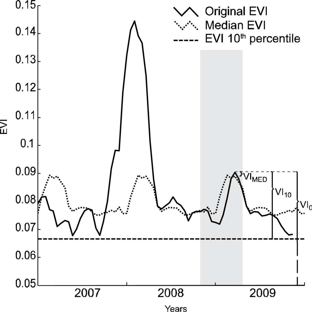 The first technique we evaluated was the vegetation index with no adjustments except for the initial smoothing (VI0). Among the three techniques, this approach can be considered as neither spatially, nor temporally contextual. VIs can be heavily influenced by the spectral characteristics of the soil background, and by the structure of persistent woody vegetation in the pixel, such that comparison of VIs between pixels with different soil backgrounds or vegetation structure is challenging [23].