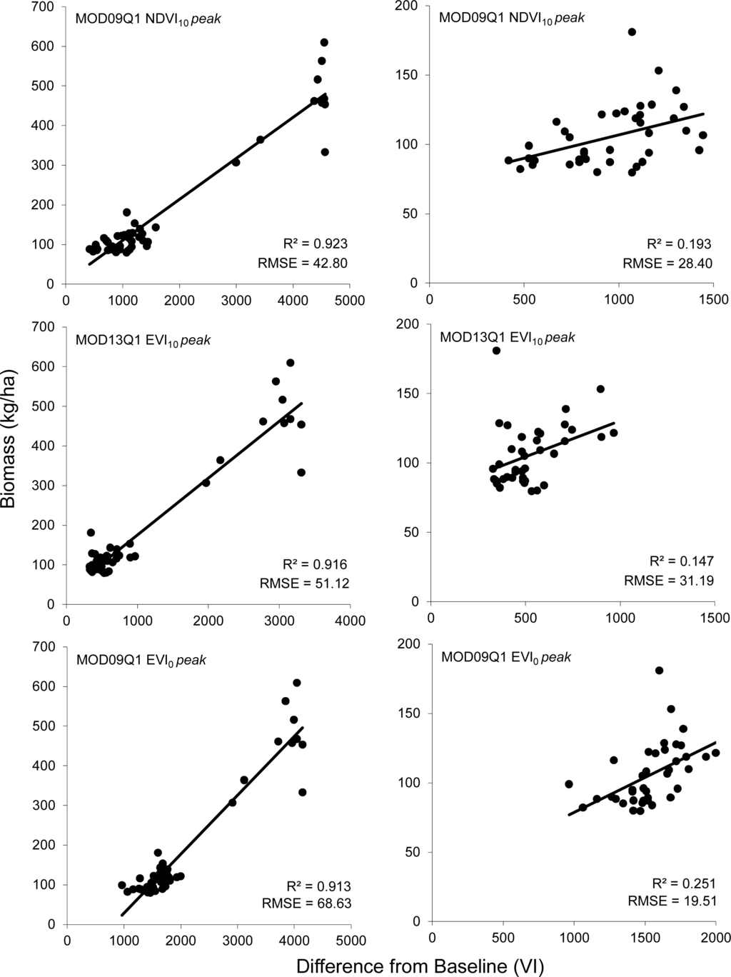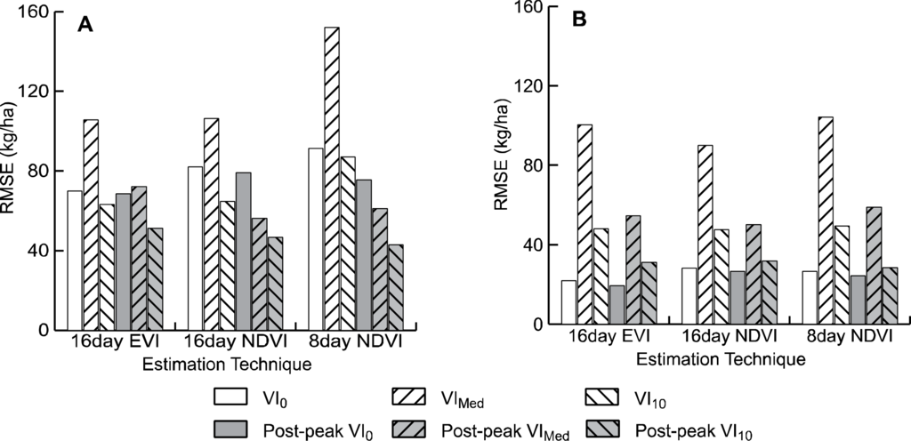 Similarly, RMSE values for the models using MOD09Q1 data highlight the importance of the temporal resolution of the data. Models using the MOD09Q1 data without adjustment for post-peak field data collection dates show high RMSE values, likely due to the use of a compositing algorithm that is not optimized for use with VIs. In spite of this, after correcting for post-peak collection dates by using peak VI values instead of data coinciding with post-peak field data collection dates, the models which utilize MOD09Q1 data have the lowest error rates. This may be due to the 8-day temporal resolution of the MOD09 data, allowing for a finer scale determination of peak greenness, and thus a more accurate correction of post-peak data collection dates.