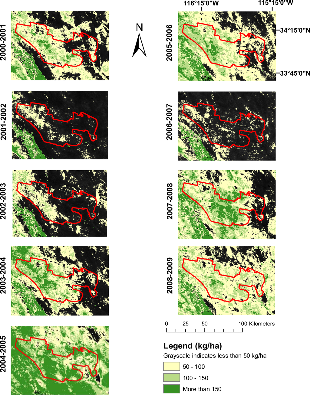 Maps such as these could also prove useful for the prioritization of management activities. For example the high production season of 2004–2005 as seen in Figure 5 was followed by wildfires in the summer of 2005 in many parts of Joshua Tree National Park. While managers were certainly aware of high levels of winter annual production in the 2004–2005 season, maps such as these could help by highlighting areas of particularly high production or large amounts of change from previous years.