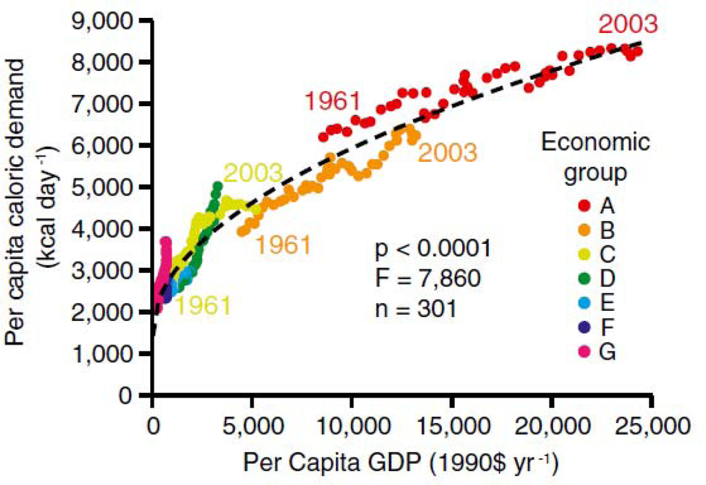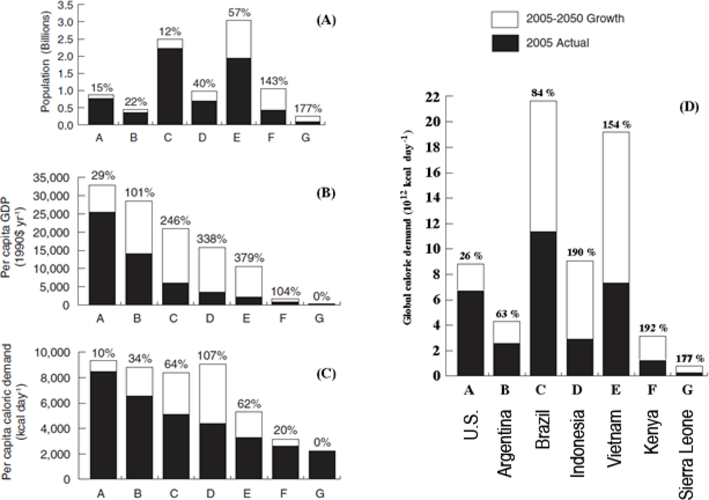 As demonstrated [3], on a global scale, per capita food demand is closely related to per capita GDP (Figure 1). For example, people in the richest countries (group A—example US) consume roughly 8,000 kcal·day−1 compared to an average consumption of 4,000 kcal·day−1 for people in group C and D (Brazil and Indonesia, respectively). Taking this into account and assuming that the Gross Domestic Product (GDP) and global population will continue to increase in the future, the past trend of strongly increasing food demand is expected to last for 3–4 decades. Tilman et al. (2011) [3] project that per capita demand for crops (caloric and/or protein) will double between 2005 and 2050. The strongest increases (in absolute values) are predicted within economic groups C to E (Figure 2(D)). The predictions are based on forecasts of per capita real income in 2050 (Figure 2(B)) and by a projected 2.3 billion person increase in global population (Figure 2(A)). The predictions within each economic group also take into account shifts in food demand and quality with increased per capita real GDP and assume that GDP increases by 2.5% annually between 2000 and 2050.