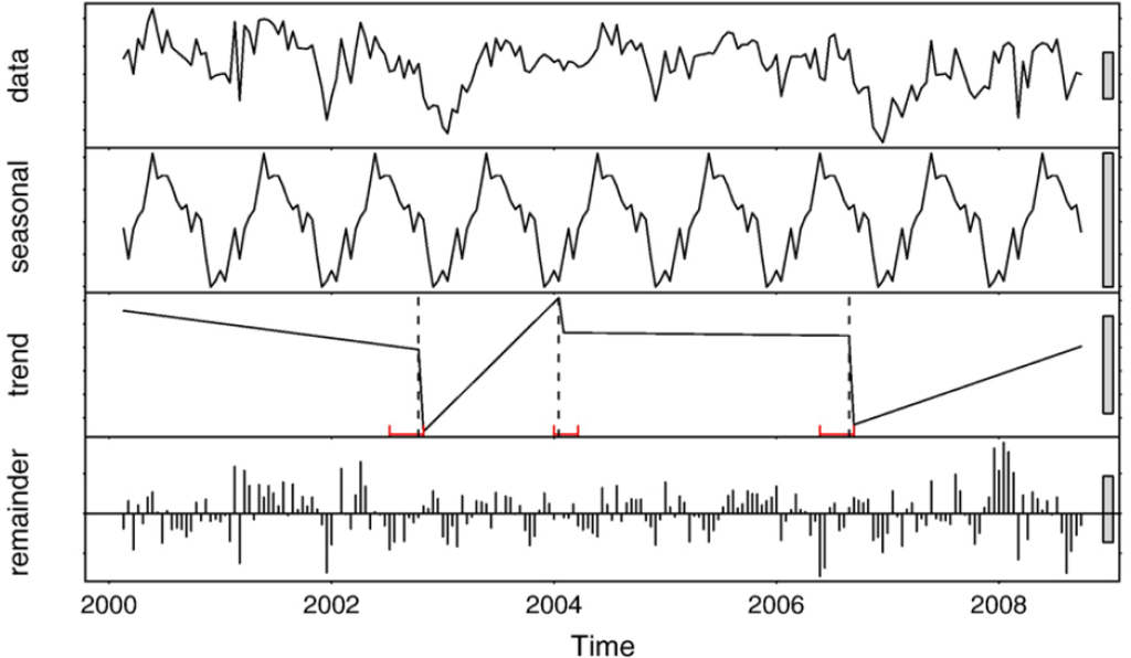 As traditional change detection methods are often not capable of detecting land cover changes within a time series that are heavily influenced by seasonal climatic variations, Verbesselt et al. (2010) [13] developed a generic change detection approach, labeled BFAST (Breaks For Additive Seasonal and Trend). BFAST integrates the decomposition of a time series into trend, seasonal and remainder components with methods for detecting change within the time series (Figure 10). BFAST iteratively estimates the time and number of changes and characterizes change by its magnitude and direction. Detecting changes within the trend and seasonal components of a time series enables the classification of different types of changes. For example, changes occurring in the trend component often indicate disturbances (e.g., fires, insect attacks), while changes occurring in the seasonal component indicate phenological changes (e.g., change in land cover type) [13].