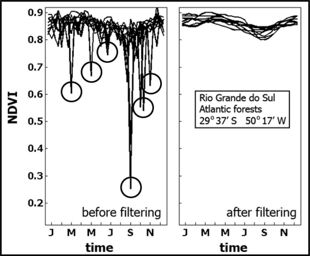The previous five sub-sections outlined some important applications of medium to coarse resolution imagery for agricultural applications. The integration of time series of vegetation indices, such as NDVI or Enhanced Vegetation Index (EVI), in various modeling frameworks is nowadays facilitated by readily available and standardized (in time and space) products [75]. Such global composites have a high potential for continuous and real-time updating. However, despite the continuous effort for making these products globally available in near real-time (for example, from the online data pool at NASA LP DAAC LP DAAC: Land Processes Distributed Active Archive Center), various processing steps are still required before complete and efficient integration in any modeling framework is possible [75]. For instance, gap filling and data smoothing are routine operations that are not yet automated. Smoothing and gap-filling are, however, extremely important pre-processing steps. Even carefully (atmospherically and radiometrically) corrected VI data sets (e.g., from MODIS) still contain substantial amounts of noise [139] (Figure 11). The various noise components are related to aerosols, to undetected (sub-pixel) clouds, as well as to BRDF effects [140]. Data gaps result from prolonged periods of permanent cloud cover. Thus, noise reduction is essential before the ‘true’ temporal evolution of the measured VI can be extracted from the satellite data for deriving added-value products.