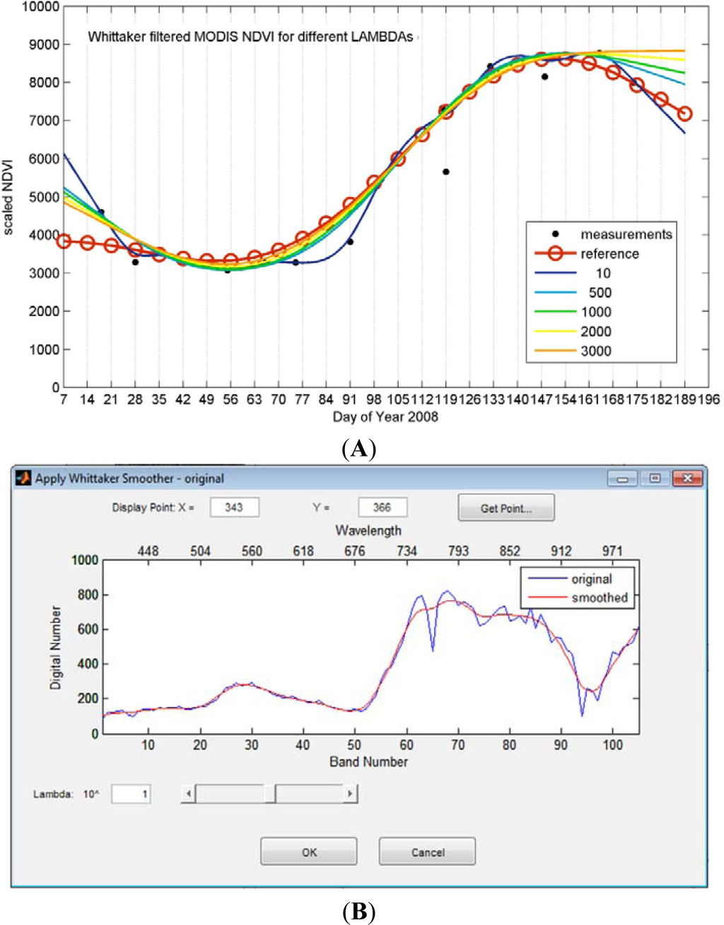 In a recent comparative study involving a number of commonly used filters, it was shown that the ‘Whittaker smoother’ (based on penalized splines) provides robust results for different noise levels and different cropping patterns (e.g., single vs. double cropping) [99]. The Whittaker smoother is based on penalized least squares. It fits a discrete series to discrete data and penalizes the roughness of the smooth curve using a single (continuous) parameter (λ: the smoothing parameter) (Figure 12(A)). In this way, it balances reliability of the data and roughness of the fitted data [144]. The filter can easily handle weights (i.e., MODIS QA flags) and inter/extrapolates automatically if data points are missing. Further details are given in [99,145,146]. A user-friendly GUI for downloading MODIS time series smoothed with the Whittaker filter is available at [147]. More detailed information regarding this MODIS tool can be found in Vuolo et al. (2012) [75]. The filter is also suitable for smoothing spectral signatures, as exemplified in (Figure 12(B)).