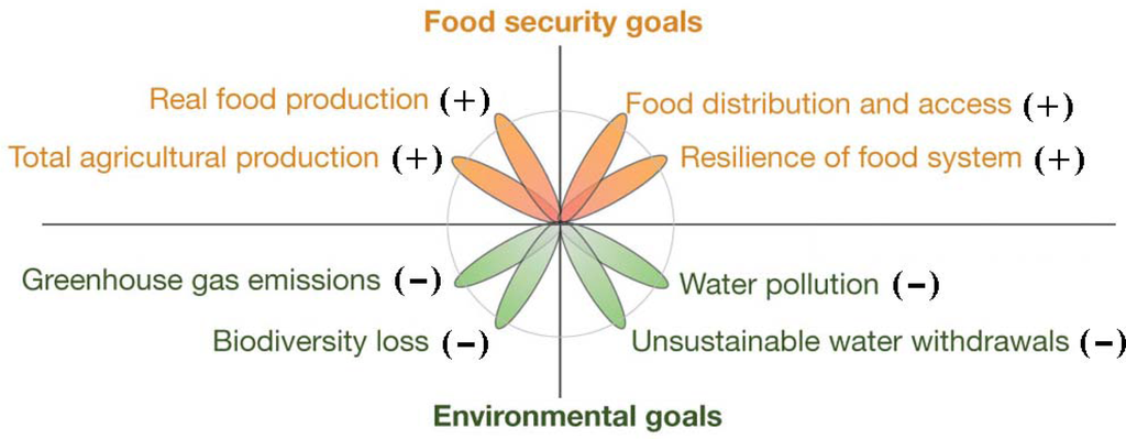 Foley et al. (2011) [2] demonstrate that tremendous progress could be made by halting agricultural expansion, closing yield gaps on underperforming lands, increasing cropping efficiency, shifting diets and reducing waste. Together, these five strategies could double food production, while greatly reducing the environmental impacts of agriculture. Similar conclusions are drawn by Godfray et al. (2010) [17], who promote a “multifaceted and linked global strategy” to ensure sustainable and equitable food security.