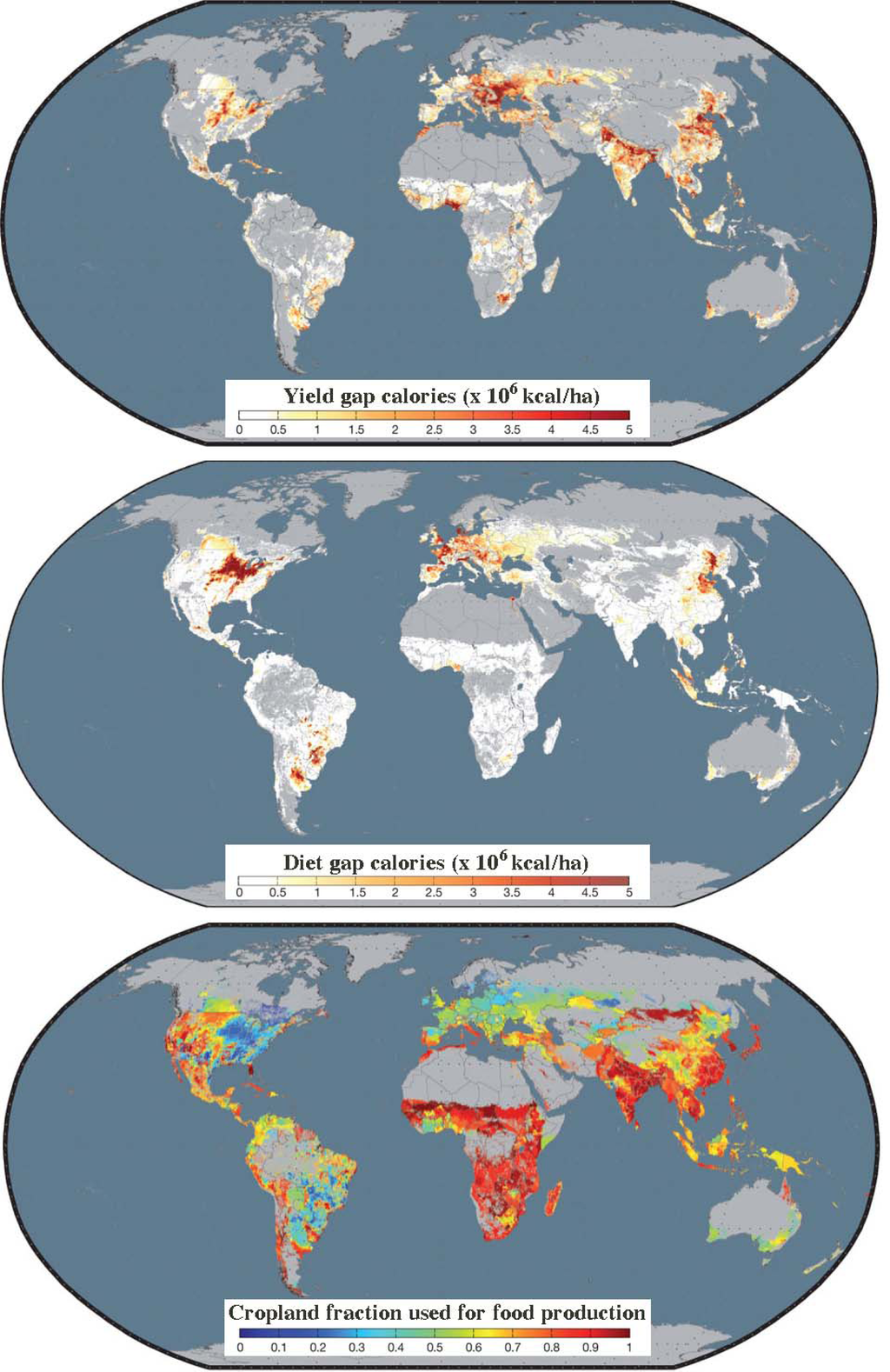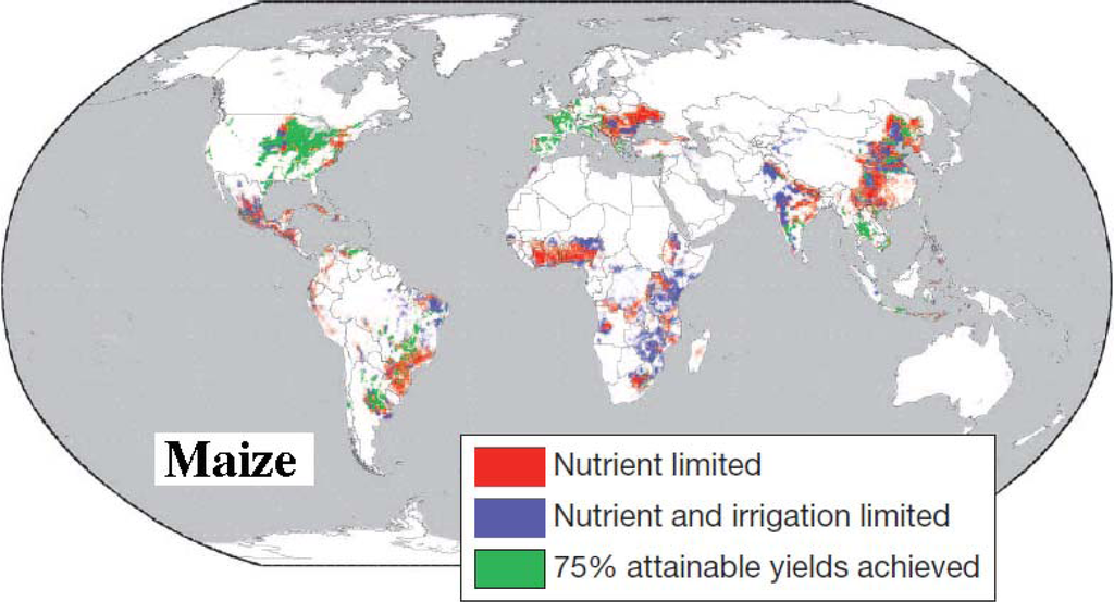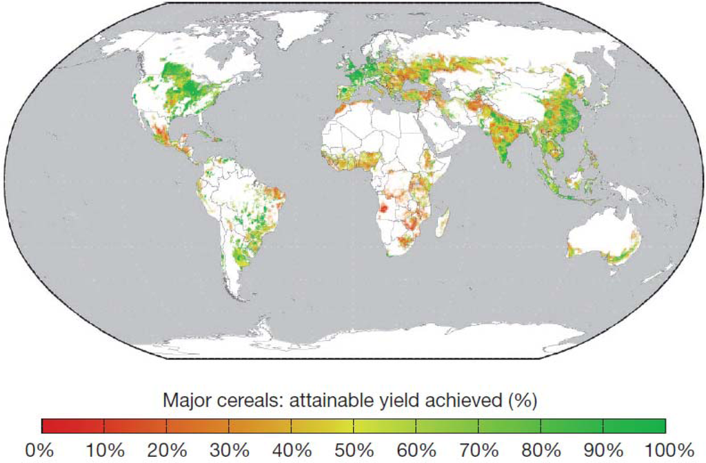 This view is also shared by Foley et al. (2011) [2]. Their analysis shows that many nations have a high potential for closing yield gaps (Figure 5(A)). In some countries, additional calories could be produced by allocating a higher fraction of the cropland to growing food crops (crops that are directly consumed by people) instead of using this land for animal feed, bioenergy crops and fibers, etc. (Figure 5(B)).