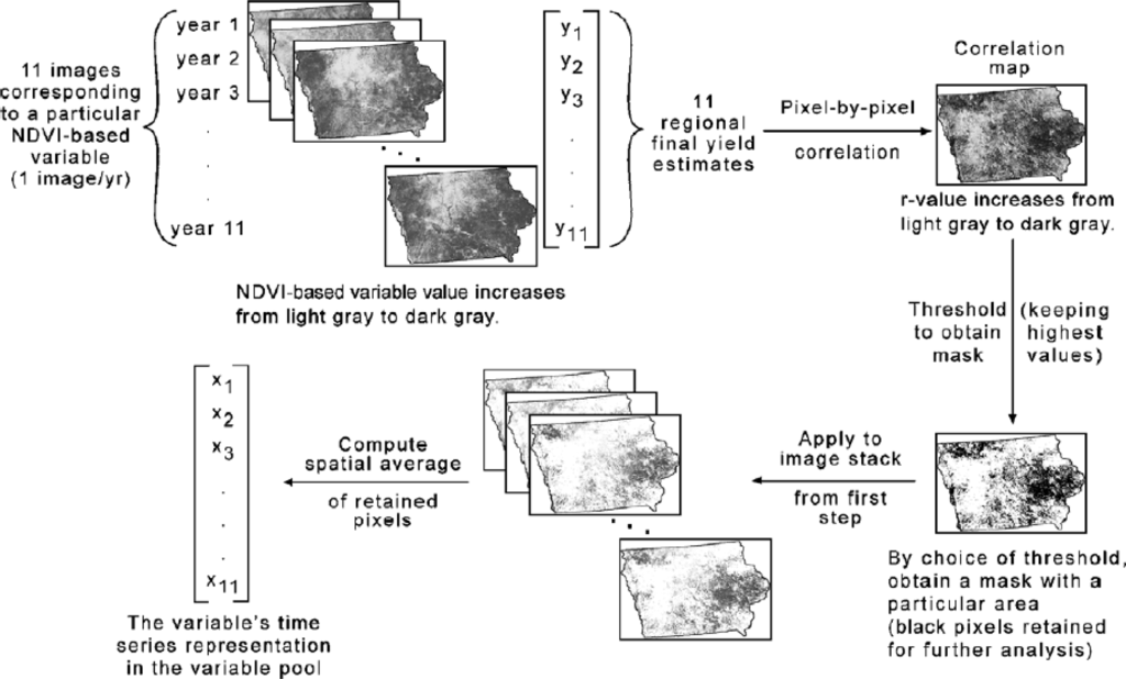 To overcome the shortcomings related to cropland masking and crop-specific masking, Kastens et al.[7] proposed a new masking technique, called yield-correlation masking. The main idea behind this concept is that all vegetation in a region integrates the season’s cumulative growing conditions in some fashion. The vegetation response to growing conditions may even be more indicative of a crop’s yield potential than the crop itself. Hence, in the yield-masking approach, all pixels are considered for use in crop yield prediction. In practical terms, yield-correlation masking generates a unique mask for each NDVI variable and each pair of crop “x” region. The technique is initiated by correlating each of the historical, pixel-level NDVI variable values with the region’s final yield history. The highest correlating pixels are retained for further processing and evaluation of the variable at hand. Figure 7 shows a diagram outlining this process for a single NDVI layer.