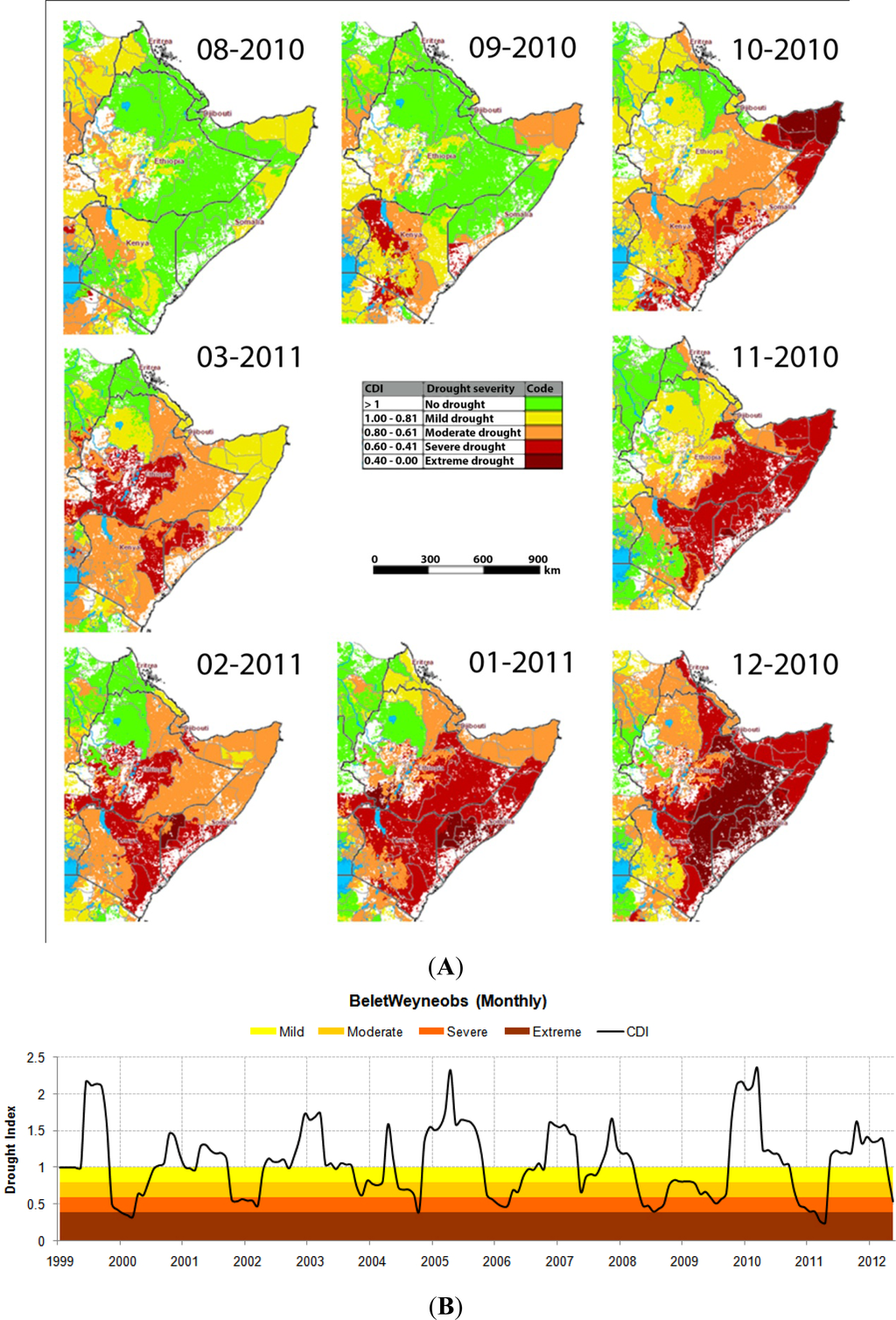 Maps of CDI for the 2010–2011 drought period in the Greater Horn of Africa (GHA) are shown in Figure 8(A). A temporal profile is shown in Figure 8(B) for Belet Weyne in Somalia together with previous strong drought periods in 2000 and 2006. In the future, such information should help international organizations, such as the UN and FAO, to declare famine early enough to prevent human losses. Regarding the 2010–2011 drought, famine was declared by the UN only in July 2011.