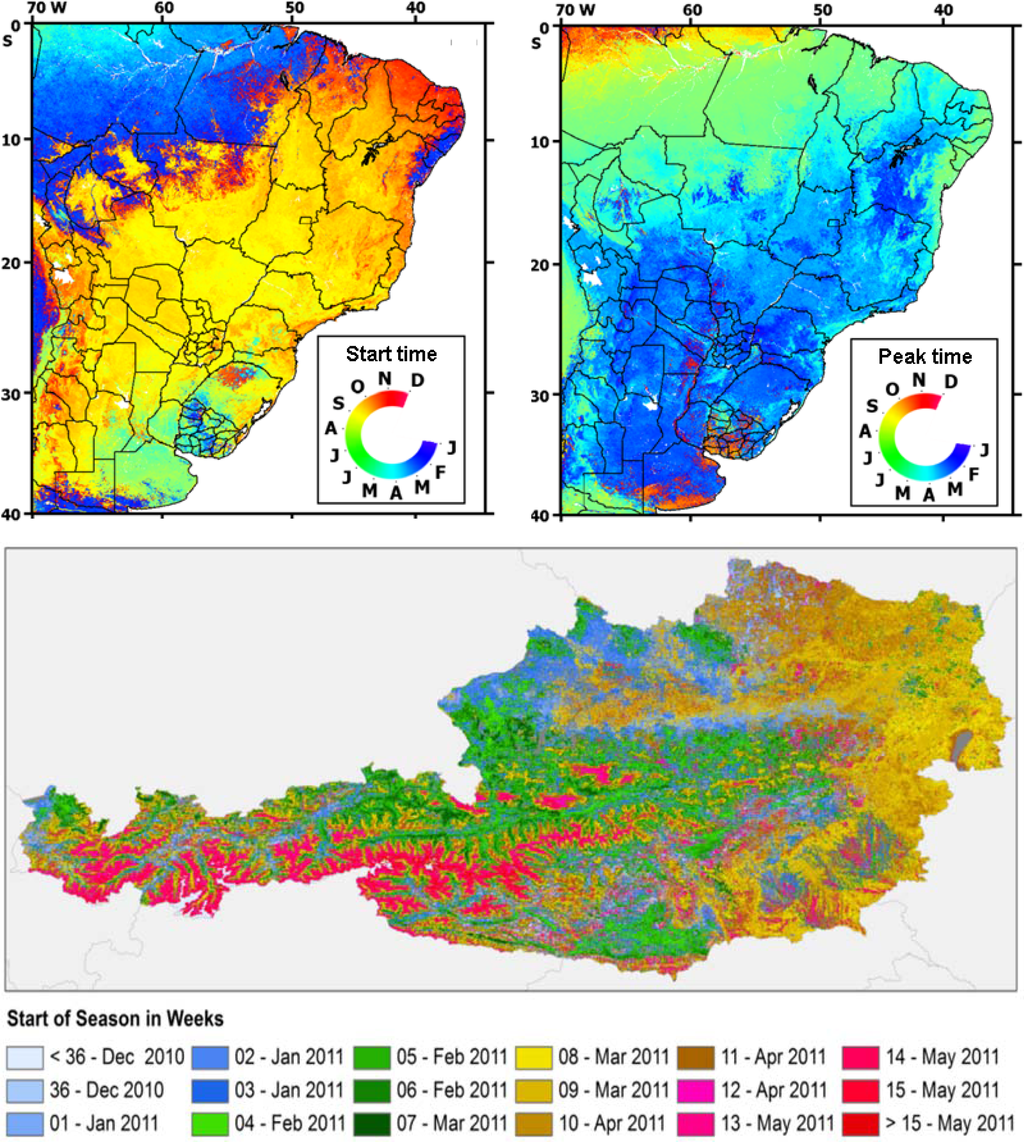 The phenological dynamics of terrestrial ecosystems reflect the response of the Earth’s biosphere to inter- and intra-annual dynamics of the Earth’s climate and hydrologic regimes [98]. Remotely sensed satellite data possess significant potential for monitoring vegetation dynamics, due to their synoptic coverage and frequent temporal sampling. This enables the monitoring of simple phenological events, such as the start and peak of vegetation growth, both in natural ecosystems and in agricultural landscapes (Figure 9).