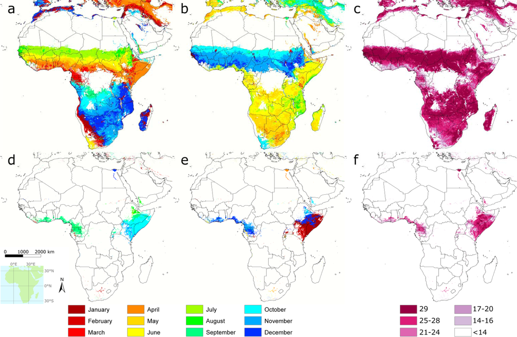We first show SOS and EOS results to understand to which growing seasons the LGP retrievals relate. Figure 1(a) shows the average SOS for pixels identified as uni-modal, and the first season for pixels identified as bimodal. Figure 1d shows the start of the second season for bimodal areas. Figures 1b and 1e depict the corresponding EOS retrievals. Note that the ‘first’ and ‘second’ do not refer to the relative importance of that season: rather the first season refers to the first of both SOS dates of the calendar year.