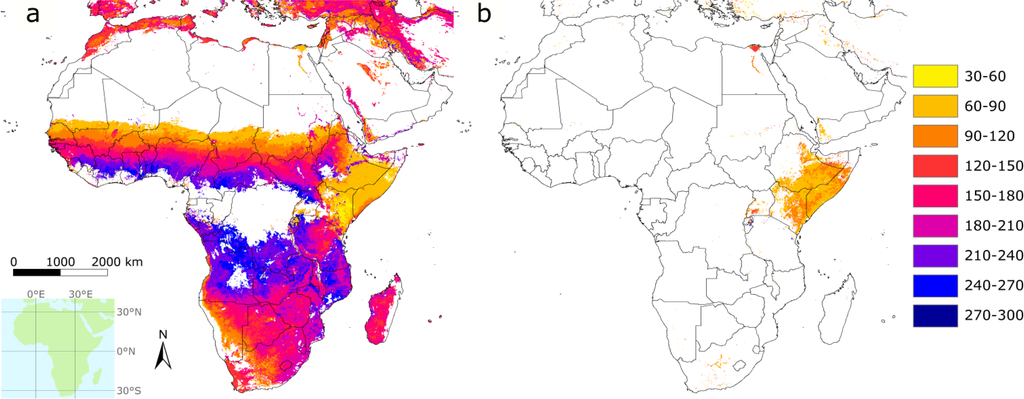 Figure 2 shows the average LGP for both seasons, as derived from SOS and EOS (Figure 1). As stated previously, areas identified as bimodal along the Guinea Coast are masked out because these may be artifacts of cloud contamination. A similar gradient as for SOS is visible from the Sahel southwards with increasingly longer growing periods towards the south. Irrigated and wetland areas (Inner Nile Delta, Lake Chad, and Gezira scheme) have significantly longer seasons due to a later EOS. Areas with an average seasonal LGP below 90 days include the Sahelian zone, parts of Namibia and South Africa, and the Horn of Africa. This short LGP limits the potential crop choices under rainfed conditions.