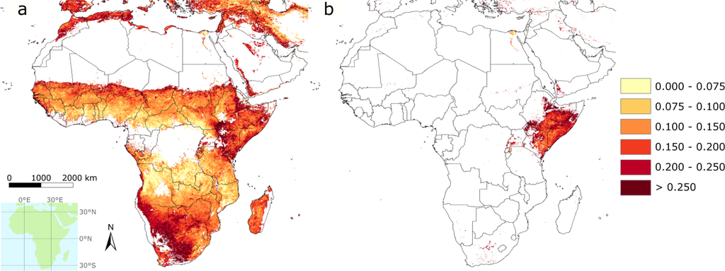 In our current implementation of the phenology extraction method, we mask on a year-by-year basis all pixels with high mean annual NDVI, low NDVI, or with limited amplitude (Section 2.2). A negative consequence of that is that for these years our LGP series report missing data (i.e., no LGP retrieval). In some cases (Kenya, Sahel), a pixel that shows for a particular year a low mean annual NDVI or amplitude may be indicative of season failure, and thus contain important information. We identified that this may not be a strong limitation for the variability assessment and trend calculation of this study, if we assume that ‘missing’ seasons are equally spread over the years. However, for other applications information on failed seasons can be important, for example when calculating probabilities of attaining a certain LGP. This could be improved by providing separate flag values for each masking condition [].