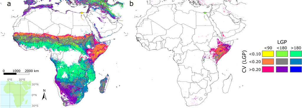 Spatial assessment of LGP can help to characterize farming systems, as stated in the introduction of this paper. Currently an update to a farming systems map for Africa is under development (for the previous version see []). Our results, especially the combination of LGP and its CV (Figure 4), have been used as an input to spatially characterizing the limits of individual farming systems for this updated map. The main benefit of our analysis in this context is the joint spatial representation of 1) which crops can be cultivated in an average year following the mean LGP, and 2) the risk involved in cultivating these crops, as expressed by the LGP variability (Section 3.2).