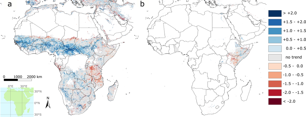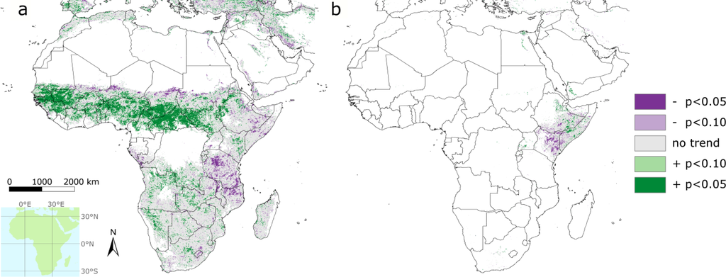 Even if 30 years of data by itself is too short to draw conclusions about climate change, LGP trends do inform us about ongoing phenological changes. Comparing these changes with trends obtained from climatic data could provide clues about their potential climatic forcing. The relatively high resolution of the NDVI data could in turn provide a downscaling of the effects of climatic forcing on vegetation, even for future projections. Under a wide-range of climate change scenarios, modelling studies predict a strong reduction of LGP for large parts of Africa for the next decades, especially in the semi-arid areas [,]. For the Sahel and parts of Eastern Africa we provide evidence that such a reduction has already started. Continuing NDVI-based spatial LGP assessments can provide ongoing evidence of this, which may complement some of the uncertainty inherent to climate models. Consistent high-quality long-term remote sensing datasets, such as the NDVI3g dataset, are a crucial input for providing converging evidence on vegetation changes. While much is to be learned regarding the human dimension of adaptation [], such evidence is strongly needed to inform potential adaptation strategies for smallholder farmers in Africa.