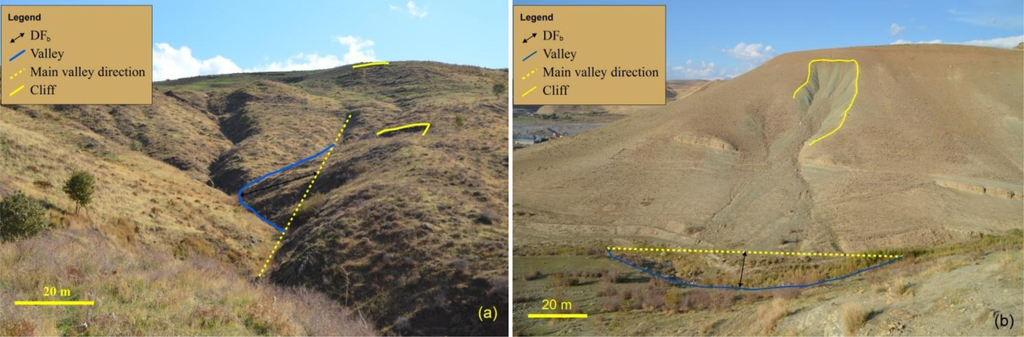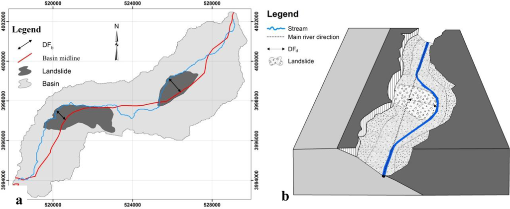 Two river offsets’ distances were calculated. We then tested the two different methods, the basin midline and main valley direction for their sensitivity to detect changes perpendicular to the main channel direction. The first one is the DFb. It is calculated by measuring the maximum perpendicular distance from river to the basin midline (Figure 4(a)), and the second is the DFd. It is calculated by measuring the maximum perpendicular distance from the river to the main river direction (Figure 4(b)). The river offset from the midline basin helps us to assess the affecting landslides for the bended basins when we cannot calculate the river offset from main river direction there. Drainage basins are symmetrical when external forces do not affect on them. Main rivers flow in the central part of the watershed and are almost superposed to the basin midline, the line located at the equal distance from both drainage divides. Landslides cause an offset of the river with respect to the basin midline. Therefore, an accurate midline extraction is important to determine the amount of offset and to detect the landslides and their influence in the stream basin. The river offset helps us to assess the effects of landslides by quantifying the variations of drainage symmetry along the stream length. We delineated the midline for basins where the main river was offset by a landslide. The midlines of basins were determined by using river bathymetry toolkit (RBT). This tool uses the Thiessen Polygons method and requires two shapefiles: the polygon layer of the basins, and the main valley lines of these basins. Both shapefiles should have a metric projection.