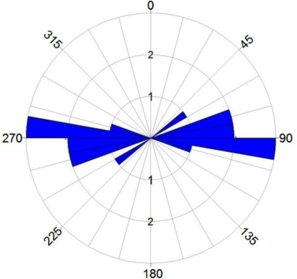 Figure 12 represents the rose diagram for the angle between the major landslide and the major thrust fault. The major landslides, which caused the river offsets, mostly have orthogonal direction to the strike of the thrust fault or have a big angle with them (Figure 7 and 12).