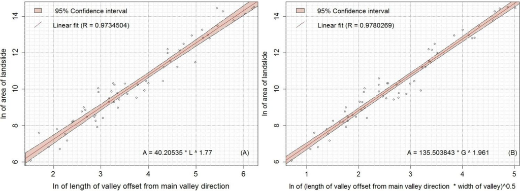 We find a good linear relation between the DFb and the landslide areas, where the statistical correlation was >0.96 (slope = 4,039) (Figure 14(a)). Figure 14(b) shows a direct relation between the log of Gm the DFb and the log of the landslide areas, where the statistical correlation was ∼0.9 (the exponent = 1.55).