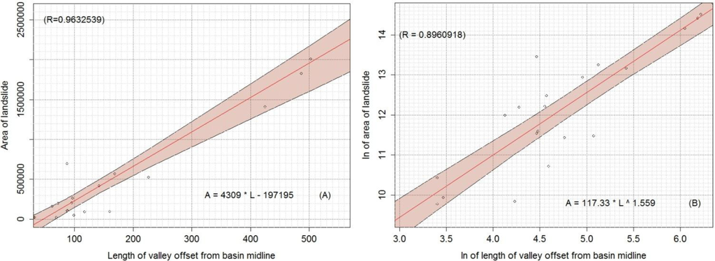After preparing the HI map and calculating the landslides area and river-offset distance, we examined the relations between landslide area, river offset, and hypsometry through linear regressions. Linear regressions were made using scripts based on R language. The first regression was preformed with the natural logarithm of the DFd, the second was carried out with the natural logarithm of the DFb, and the third with the natural logarithm of geometric mean of the DFd and river width (ln (Gm)). The purpose of using the Gm is to illustrate the width of river influence on the river offset. In addition, we analyze a linear regression between the landslide areas (A) and the DFb. The basic relationship of river-offset distance and area of landslide can be expressed as follows: