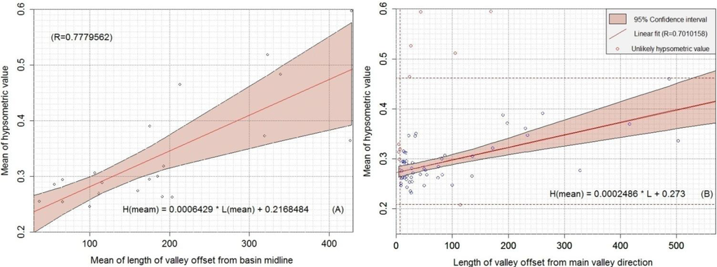The river-offset distance increases with the HI mean value of the bent river (Figure 15(a,b)) because the triggered area has a lower topography than the crown of the landslide, but is still higher than the river. On the other hand, the HI value is dependent on curvature of the surface. Therefore, the major landslides have a direct linear relationship with the cliff elevation; the curvature of the major landslides is less concave than the small landslides near the rivers.