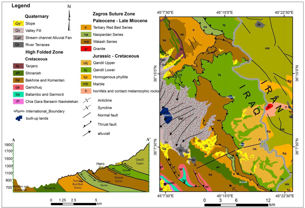 The NW-trending Zagros orogenic belt is a part of the Alpine–Himalayan mountain chain [,]. It is approximately 2,000 km long and extends from southeastern Turkey through Iraq to southern Iran. The study area lies within the Arabian Unstable Shelf, represented by the High Folded Zone (HFZ), the Imbricated Zone (IZ), and the Zagros Suture Zone (ZSZ) (Figure 1) []. The ZSZ was formed within the Neo Tethys as a result of the collision between the Arabian and the Iranian plates during the Late Cretaceous and Mio-Pliocene periods. Three NW-trending tectonic zones were formed in the ZSZ: the Qulqula-Khwarkurk Zone, which consists of radiolarian chert, mudstone, and limestone, conglomerates and basic volcanic rocks; the Penjween-Walash Zone, which consists of metamorphosed rocks, carbonate beds with volcanic and pyroclastic rocks; and, the Shalair Zone, which consists of meta-pelitic and meta-carbonates, volcanic, and metamorphosed rocks, in addition to different types of Quaternary sediments (river terraces, stream channel alluvial fans, slope sediments, valley fills). The Penjween-Walash Zone outcrops are only present in the eastern part of the study area. The Penjween-Walash Zone consists of nine structural units, four of them located in the Iranian part, and five in Iraq. Whereas the Penjween-Walash Zone located in Iran is comprised mainly of metamorphic rocks and granite [], mainly sedimentary rocks, metamorphosed limestones with some serpentinite intrusions and a volcanic sequence including lava flows, ashes and dykes are found in the Iraqi region. The HFZ and the IZ are located in the western part of the study area; they include six sedimentary units (mainly limestones, marls, shales, dolomites, sandstones, mudstones, claystones and conglomerates) [,]. The HFZ and the IZ ages range from Middle Jurassic (Callovian) to Upper Cretaceous (Maastrichtian) (Figure 2) [].