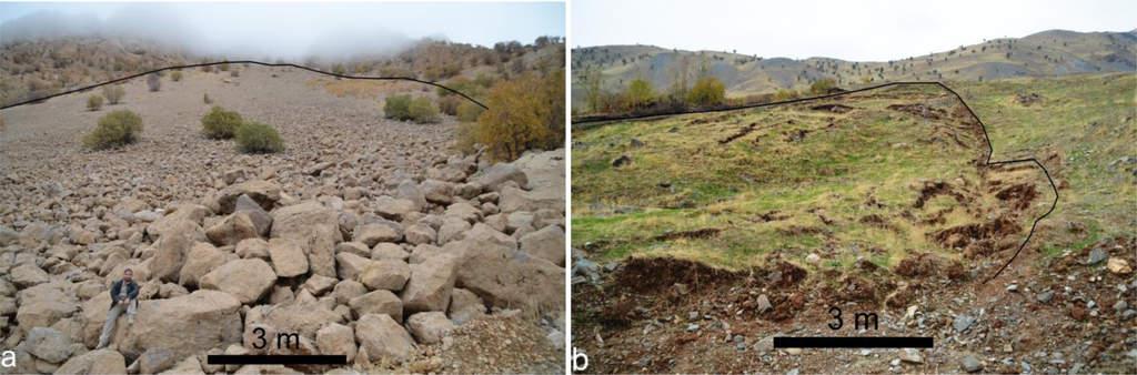 Remote sensing data can be used to detect a landslide over a large area. High-resolution satellite data are thus a useful tool for studying landslides []. The availability of new satellite data with better spatial and spectral resolution permitted the use of satellite data instead of aerial photographs for a better detection and investigation of landslides. It allows a quick detection and mapping of landslides. We prepared an inventory map of landslides from two sources. First, existing geological maps [–] with mapped landslides were scanned and georeferenced. We completed this data, with the interpretation and digitization of QuickBird scenes using ArcGIS10 software. The landslide boundaries were identified from the satellite data based on characteristics such as tone, texture, the headwall scarps, and associations like the pathway of the material movement, and fragments of transferred materials. We used Varnes’ (1978) classification to classify the landslides. We partly verified our observations by field survey in different parts of the study area.