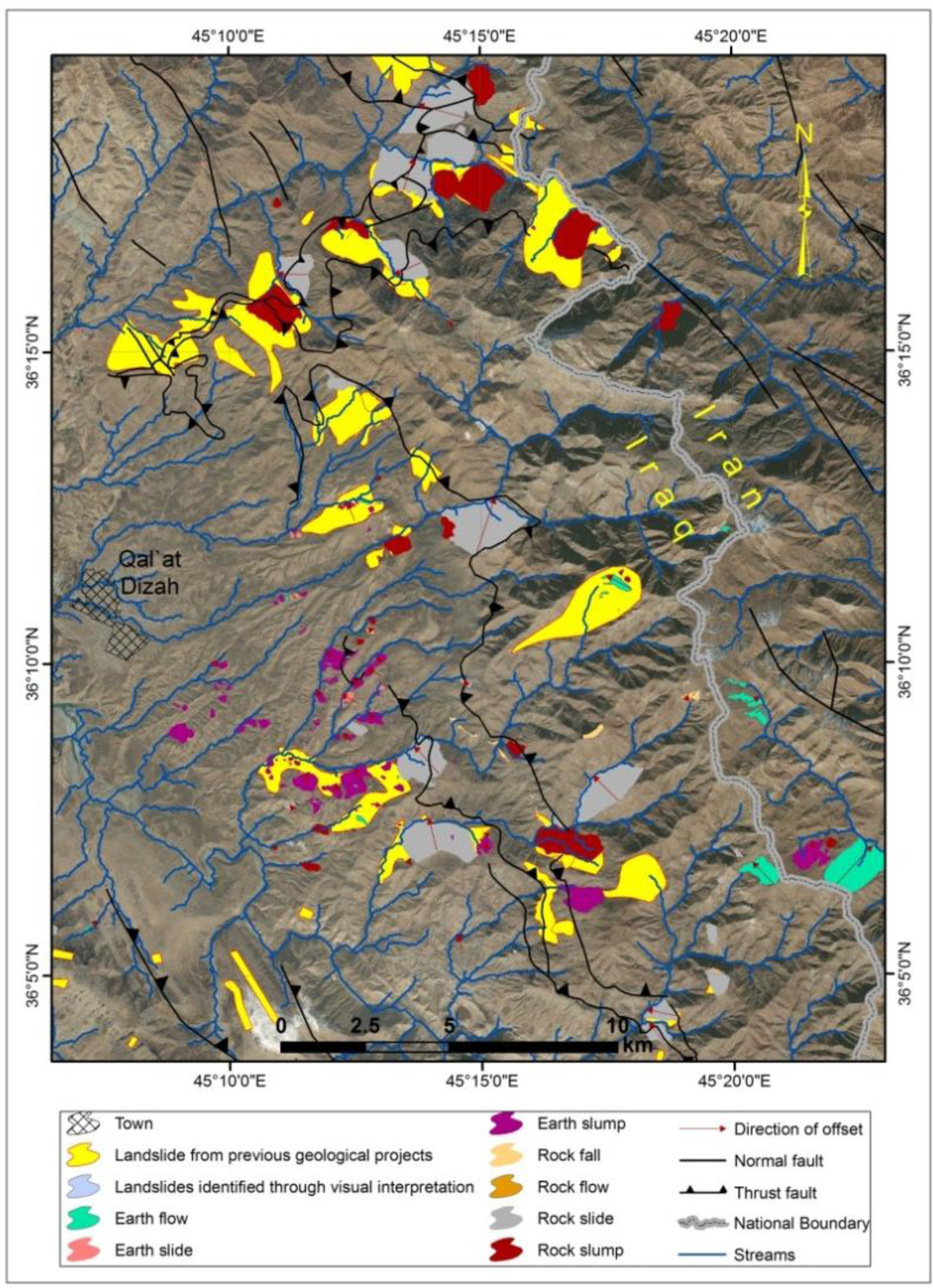 We mapped 280 landslides in an area located along the Iraq–Iran border through the analysis of nine QuickBird scenes. The most representative landslides include rock falls, debris flows, translational slides, and slumps. The densest distribution of landslides in the study area has a NW–SE trend due to the tectonic influence of the Zagros orogenic belt. We also analyzed river offsets and hypsometry in the areas affected by landslides. This study also indicates that landslides cause many rivers offsets and that there is a correlation between the offset amount and the landslide area. A correlation between the offset amount and the hypsometry was also found. The major landslides, which caused the offset for the rivers have orthogonal direction to the strike of the thrust fault or have a big angle with it. This demonstrates that the main thrust fault controls the sliding direction of landslides. The HI values range from 0.74 to 0.14; the threshold number of 0.35 is occurs at the contact between the ZSZ and the IZ and it nearly corresponds to the main thrust fault. The hypsometry suggests a strong control of main thrust on the topography.