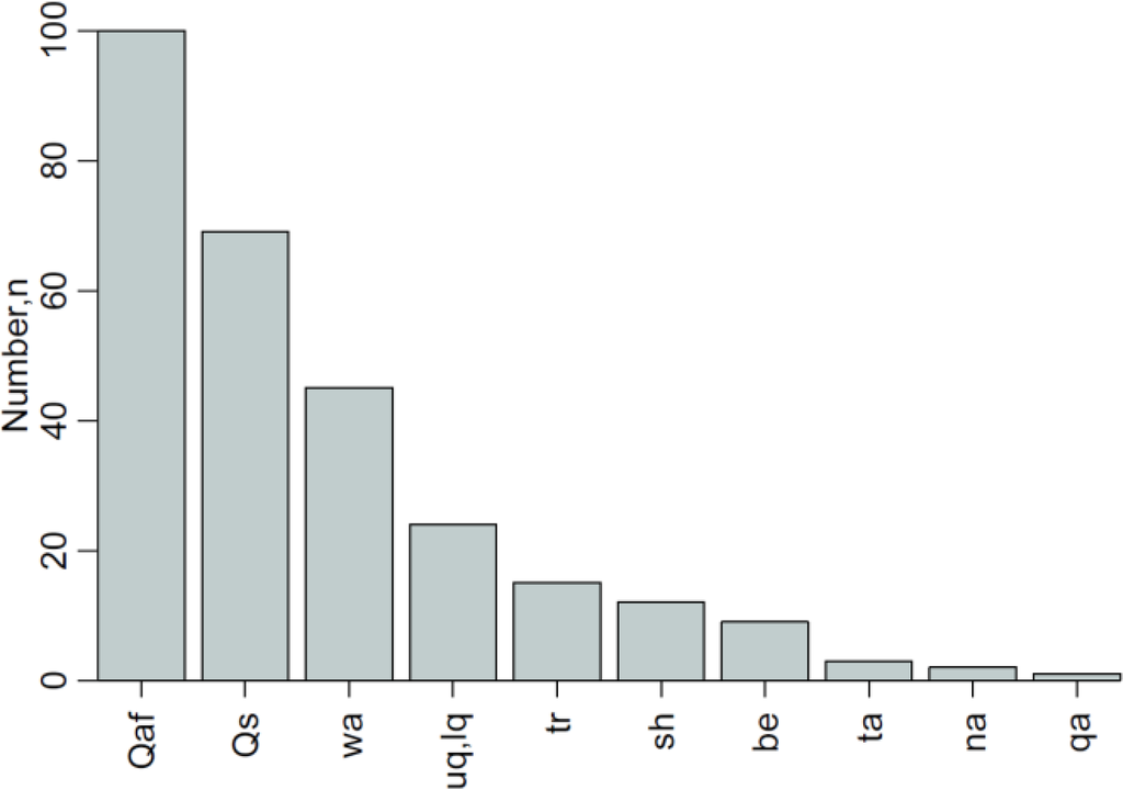 Figure 8 shows the formations most commonly involved in landslides throughout the study region. Rock types have been broadly classified into “coherent,” “moderate,” and “weak” units based on the dominant character of each as inferred from unit descriptions and from qualitative assessments made in the field. For example, rocks of the Walash series (e.g., wa, Table 2) were considered coherent, while Tanjero Formation (e.g., ta, Table 2) were classified as weak. Figure 8 illustrates that both coherent and weak rocks occur with high frequency in the landslides mapped.