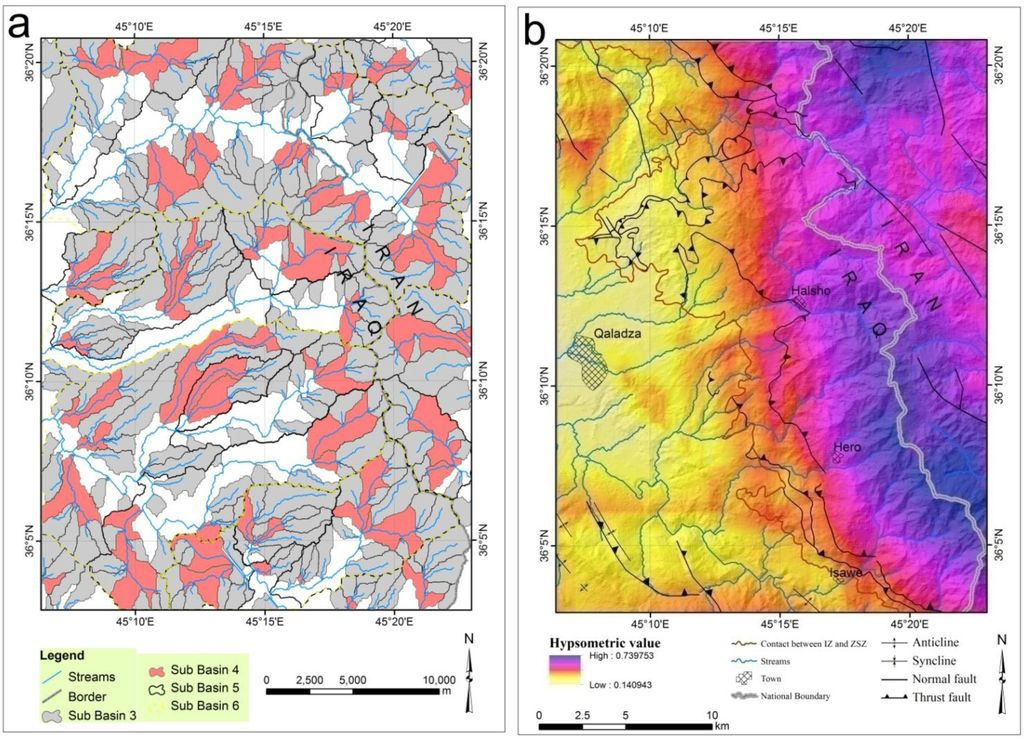 The study area is located between 36°00′–35°30′N latitudes; 45°00′–45°30′E longitudes, in the Zagros mountains, where mass movements threaten many towns and villages. It covers an area around 1047.7 km2 and encompasses the Sulaimaniyah Governorate (Kurdistan Region) in Iraq and the West Azerbaijan Province in Iran (Figure 1).