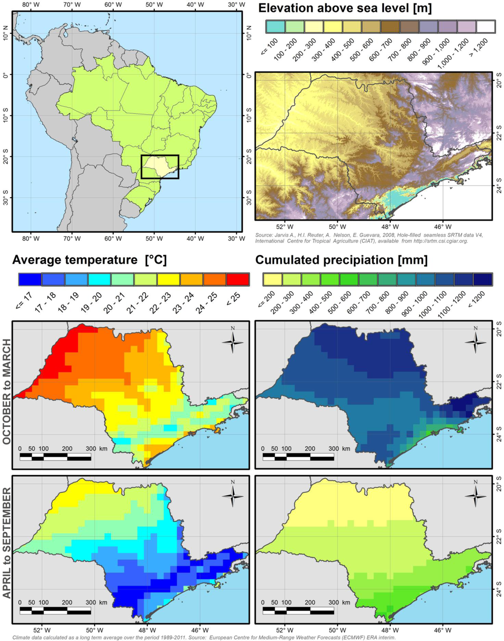 The climate of São Paulo state is tropical to subtropical, which is optimal for sugarcane growth. Total rainfall is about 1,300 mm per year concentrated in a humid season which extends from October to March, when average temperatures oscillate around 23 °C with a strong SE-NW gradient (see Figure 1). During the dry period between July and September, temperatures drop to approximately 19 °C. According to the Köppen climate classification system, the state can be divided approximately in two along an E-W division between the two main climates: tropical savannah (Af) in the North and humid subtropical climate (Cfa) in the South.