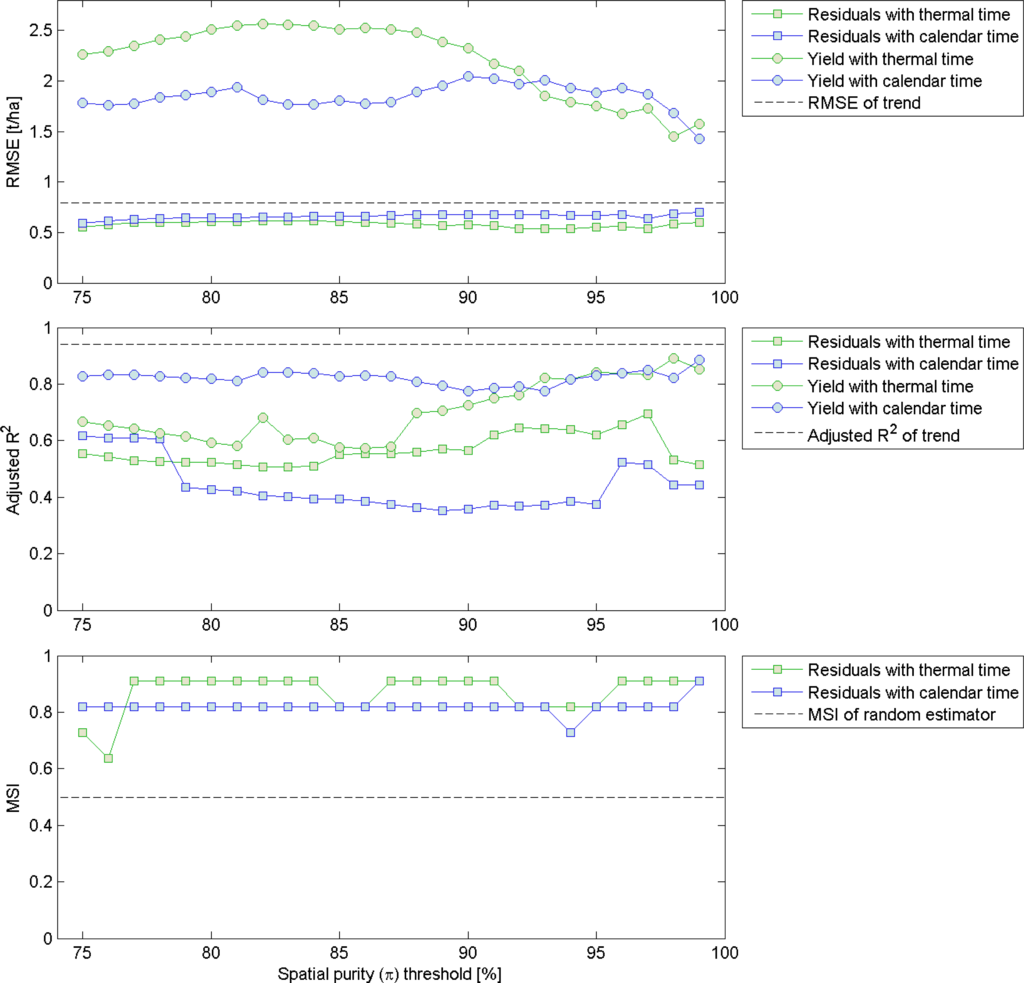 The analysis based on absolute yield indicates that a considerable part of its variability during the study period is detectable by remote sensing. The results further show there is an influence of time series purity on the accuracy of the estimations. This influence is stronger for the analysis based on thermal time, which provides worst results than calendar time up to around π thresholds of 90%, after which accuracy increases considerably, showing better performances than calendar time with respect to RMSE. For the higher purities, both thermal and calendar time analyses can explain almost as much variance as the trend, as shown by the R2adj values higher than 0.8. While the corresponding RMSE of around 1.5 t/ha still appears considerably higher than that of the trend (0.78 t/ha) in absolute value, if it is compared to the average state yield it represents less than 2% of error.