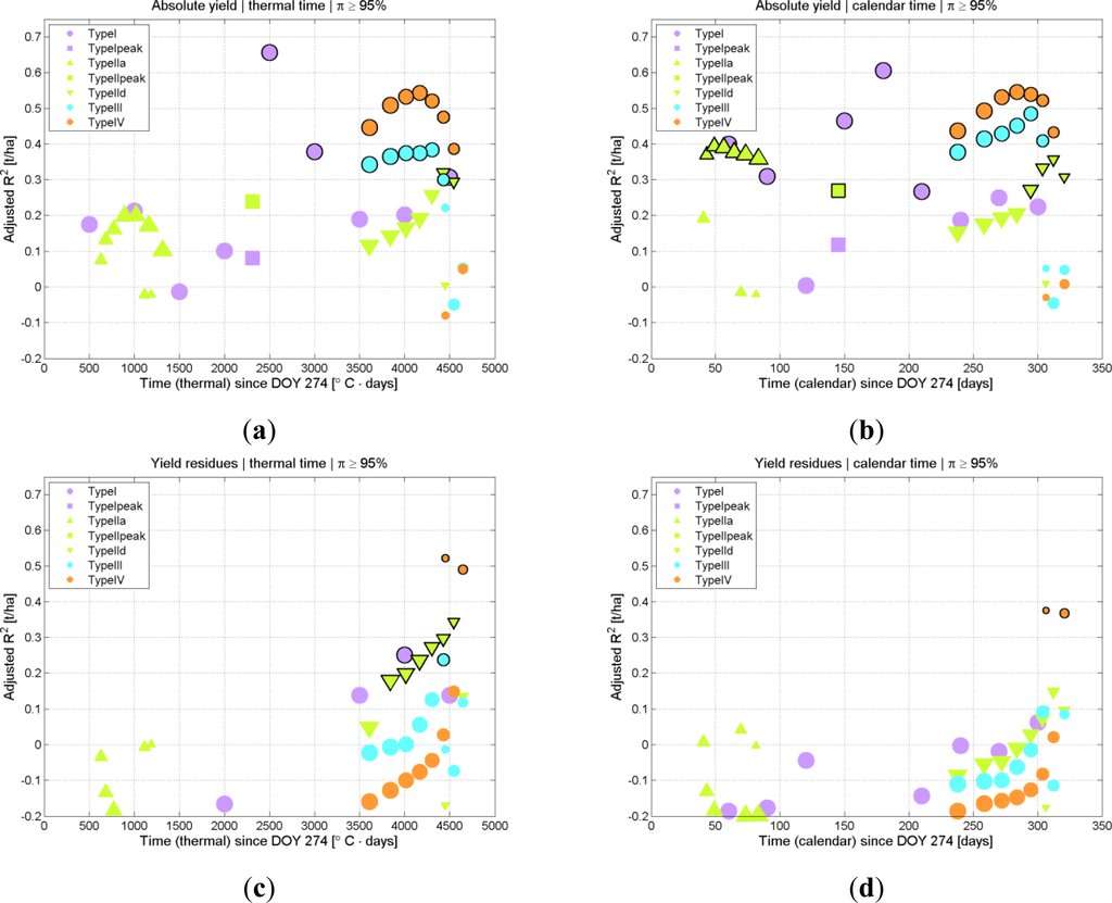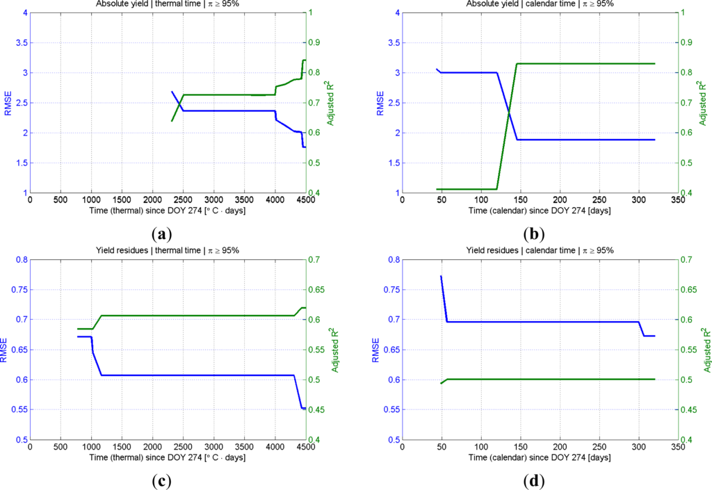 As mentioned before, Figure 11 only presents results from univariate regressions. Since the best performances are generally obtained using a bivariate regression (as seen in Table 2), the issue of timing for these cases is also included in Figure 12, where the performance of the best available (and significant) set of metrics is plotted against its timeliness. The example shown (for π ≥ 95%) illustrate how, for the yield residues based on thermal time, it may not be worthwhile to use the best set of metrics since they are only available very late in the season and provide only a marginal increase in performance, while a decent estimation is already available much earlier. In the case of absolute yield estimated with calendar time, the best set of metrics is already available quite early in the season.