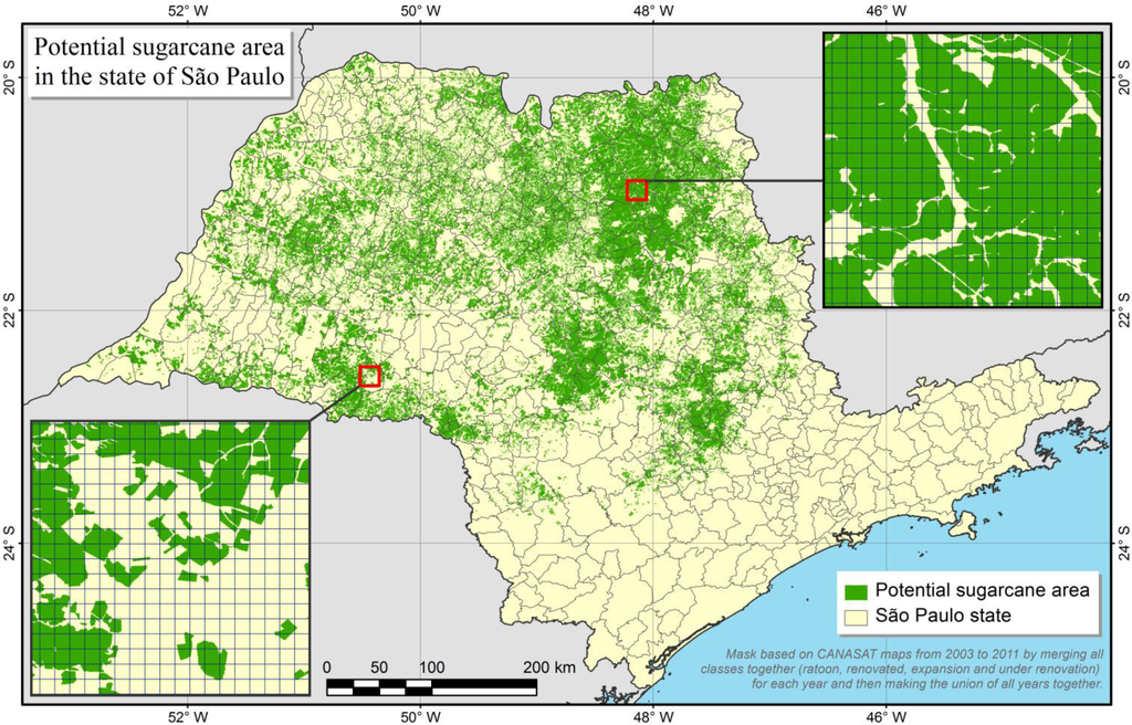 A conservative approach has been taken in this study by creating a single multi-annual sugarcane mask that includes all the area where sugarcane is susceptible to have been present at some point during the study period (1999–2000). To do so, all four classes within each Canasat map from 2003 to 2011 are merged together in a first step. Then, a mask of the potential sugarcane area is obtained by merging all nine yearly masks and dissolving the polygons together. This mask therefore includes zones that have witnessed transitions from other land covers or land uses towards sugarcane, and vice versa (although the latter probably to a much lesser extent). The result is presented in Figure 2 along with some close-ups indicating the fragmentation of the landscape. The original mask based on Canasat data is available in vector format but here it has been rasterized to 100 m by 100 m pixels before using it in the forthcoming processing steps.
