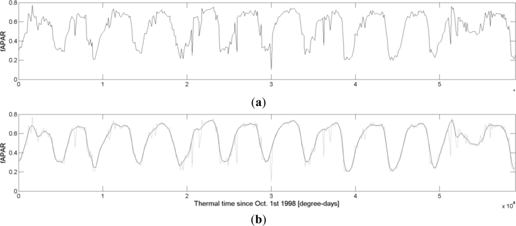 Secondly, a temporal smoothing is done with the Whittaker smoother [31–33]. Although not well-known in the remote sensing literature, according to [32] this filter has a series of advantages over the more popular and well-known Savitzky-Golay filter. Perhaps the single most important advantage is that of balancing two conflicting goals, namely preserving data fidelity and minimizing the roughness of the smoothed time series, by adjusting a single parameter λ, whose value can be set automatically using cross-validation [32]. It has been shown to perform well in remote sensing studies at sub-continental scale, notably in South America [34] and India [35]. The Whittaker smoother is here applied twice on each fAPAR time series: once with the individual fAPAR values plotted in thermal time and once using normal calendar time (using the actual dates of the fAPAR observations and not the 10-day composite dates). For each time series, λ is separately calculated. An example of the resulting smoothed time series is shown in Figure 3.