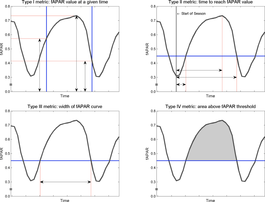 The third type of metric, which is related to the previous type, is the time separating the ascending and descending parts of the curve at a given fAPAR threshold, providing an idea of the width of the curve that is not related to the start of the season. Thresholds also range from 0.2 to 0.6 and metrics are labelled with the same nomenclature (TypeIIIxx). The final type is the area beneath the curve and above a given fAPAR threshold (again chosen from 0.2 to 0.6 and labelled TypeIVxx).