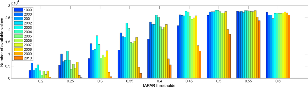 The total number of different individual metrics is 47. An important point to remark is that the same number of values will not be available for each metric. More specifically, metrics depending on fAPAR thresholds (Types II, III and IV with the exception of TypeIIpeak) are not available when the remotely-sensed estimation of fAPAR does not reach either a threshold that is too high or too low. Furthermore, as it can be seen in Figure 5, the number of available values for a given fAPAR threshold may vary from year to year. Metrics of Type I (and TypeIIpeak) always have the same number of values since there is always a fAPAR value at a given time (and there is always a maximum fAPAR).
