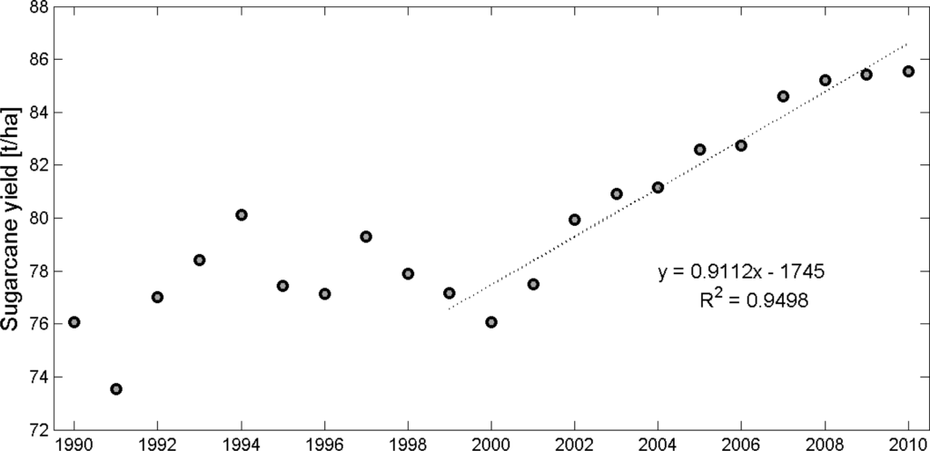 The IBGE ( www.ibge.gov.br) publishes every year statistics of total production and harvested area of the major crops at different spatial scales from country to municipality level. Therefore, official sugarcane yield can be therefore calculated as the ratio between the total production and the harvested area. The evolution of sugarcane yield in the São Paulo state during the period 1990–2010 is described in Figure 6. A significant trend drives the evolution of sugarcane yield after the period 2000–2002. In the study period (1999–2010) the yield trend is approximated by a linear function, explaining already up to 95% of the sugarcane yield variation. Several authors [16,36] explain this trend by the growing interest of sugarcane in Brazil as a source of biofuels, the increased price of energy and the fact that much newly planted sugarcane (expansion class) has higher yields in the first harvest.