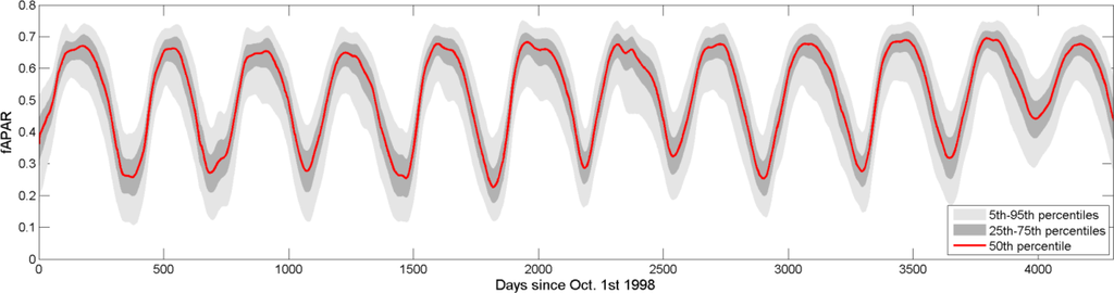 Prior to analyze the predictive capacity of the remote sensing dataset to estimate yield, an overview of the spatio-temporal information contained in it is illustrated in this section. Figure 7 provides the 5th, 25th, 50th, 75th and 95th percentiles of the ensemble of pixels with a crop specific spatial purity above or equal to 75%. These represent the overall expected behavior of sugarcane. Interestingly, during the austral winter between the last two seasons (in 2009), the biomass, as detected by the remote sensing fAPAR, did not fell as low as during the previous years, explaining why less metrics are available for the last two seasons (as seen in Figure 5). These unusually high fAPAR values observed at the end of the 2009 season are a consequence of the intense precipitation cumulated during the period between August and October 2009 in the northern half of the region, where most of the sugarcane is cultivated. According to ECMWF data it rained 270 mm for that period, which is more than twice the seasonal values (105 mm).