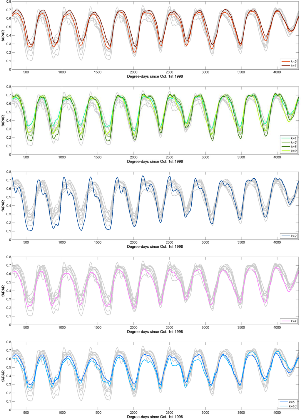 Recent work has shown that, in the crop specific context, smoother and more temporally coherent time series of canopy biophysical variables can be obtained by considering thermal time instead of normal calendar time [25]. The concept that there is a relationship between the development rate of crops and temperature was advanced by Réaumur as early as 1735 [26]. The main physiological explanation of why temperature affects plant functioning comes from the many enzymatic activities occurring within the plant, and which are regulated by a minimum, maximum and optimum temperatures [27,28]. Thus, the time taken for organ growth and development, or between different developmental stages, depends on temperature. There is a considerable advantage in describing crop development based on thermal units because the amount of thermal time required to reach a certain ontogenetic phase is relatively constant, while the time in days may vary considerably [29]. Therefore, measuring time with thermal units, such as cumulated daily temperatures above a threshold (in growing degree-days), can have a considerable advantage over using normal calendar time, especially when analyzing data where the temperature varies from season to season or from one place to another [30]. By plotting fAPAR profiles in thermal time it becomes possible to compare fAPAR attained at a given phenological state, thus limiting the effects of eventual shifts in crop development along the season associated to differences in annual temperature regimes.