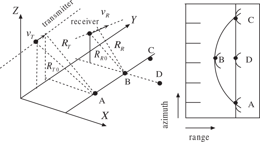 Consequently, the locus of the slant ranges at the beam center crossing times of all targets that are parallel to the azimuth axis follow an approximate hyperbola. As an example, we consider a typical geometry shown in Figure 3(left), where the (x, y) plane is locally tangent to the Earth surface. The targets are assumed to lie on this plane, and the transmitter velocity vector is parallel to the y-axis. Figure 3(right) shows the trajectories of three targets A, B, and C follow a hyperbolic locus. As a consequence, the imaged targets A, B and C will have an equal slant range, i.e., the target B will be shifted to the position D. This is different from general monostatic case, which has a linear locus instead of a hyperbolic one. General range Doppler image formation algorithms cannot handle this problem in a high-precision manner. Consequently, there will be a range ambiguity that does not exist in monostatic SARs. It can be observed from Figure 3 that two and more targets (e.g., A, C and D) locating at different positions with the same range delay at the zero-Doppler but will have different range histories (curvature). Similar phenomena was investigated in [35], where a ground-based stationary receiver is assumed. However, for nonstationary receiver this problem will be much more complex, because the transmitter follows a rectilinear trajectory, while the receiver follows also a rectilinear trajectory and has a different velocity.