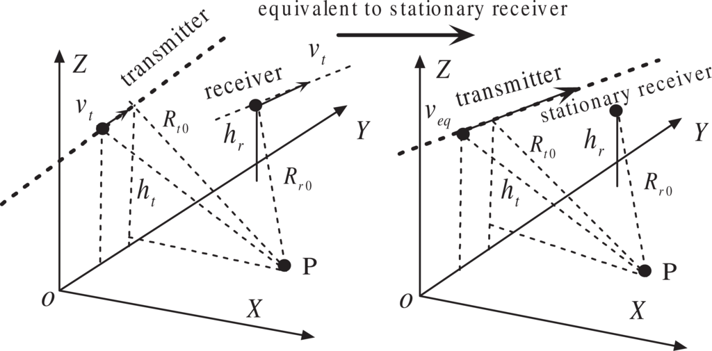 The HAP-borne passive BiSAR involves placing a passive receiver inside a HAP and utilizing opportunistic illuminators such as global navigation satellite systems (GNSS) and spaceborne or airborne radars. The use of GNSS as the transmitter has the advantages of entire planet coverage and simple transmitter-receiver synchronization [22], but the received GNSS signals are too weak [23–26]. To overcome this disadvantage, this paper uses spaceborne or airborne radar as the passive BiSAR transmitter, in which the transmitter and receiver may have unequal velocities. Note that, although the passive receiver may be stationary, an aperture synthesis can still be obtained by the motion of the transmitter only.