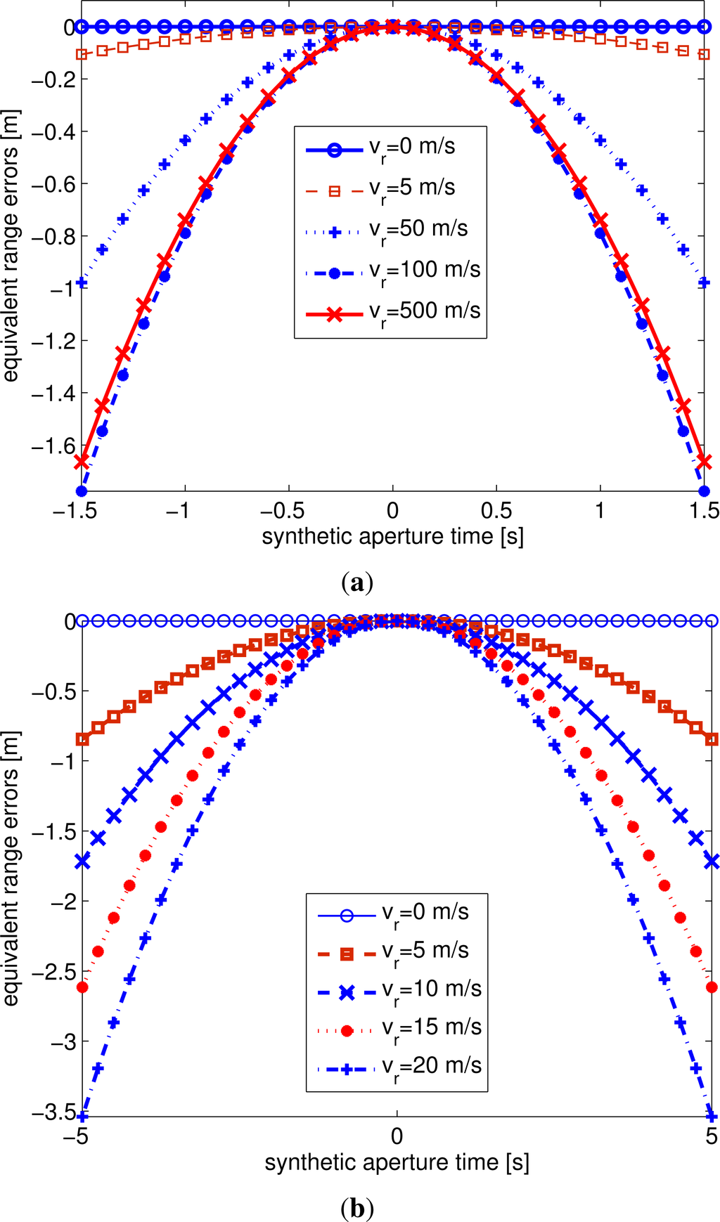 Suppose the transmitter slant range and receiver slant range are fixed to be 800 km and 30 km, Figure 6 gives the range errors caused by the equivalent BiSAR system model. As the relevant phase errors that are smaller than π/4 can be ignored for subsequent imaging algorithms, we can conclude that the equivalent model for small vr is satisfactory for subsequent image formation processing.