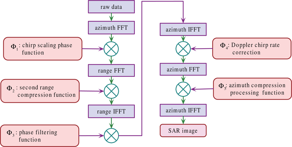 Next, a NCS algorithm, which is similar to the algorithms developed in [35,41], can then be applied. Our algorithm has the processing steps similar to [35,41], but has different compensation phase terms, Φi (i = [1, 2, 3, 4, 5]), because the azimuth-variant Doppler characteristics are considered in deriving the algorithm. Suppose the transmitted signal is