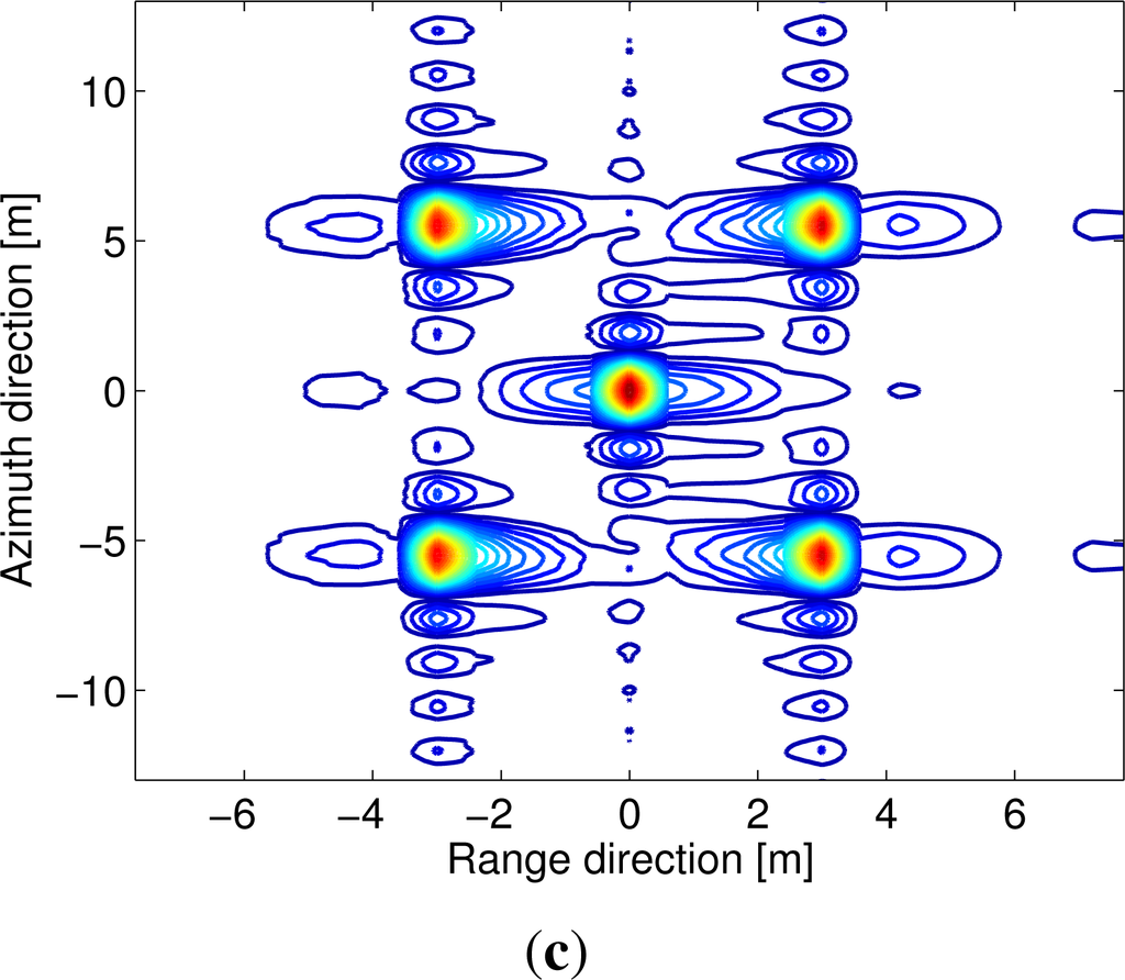 For a general monostatic SAR system, a focused SAR image can be obtained from a two-dimensional inverse Fourier transform of Equation (19). However, this method is not effective for the azimuth-variant BiSAR configurations. One reason is that azimuth Doppler frequency is non-uniformly sampled for the azimuth-variant BiSAR configurations, and the other reason is that its precision two-dimensional spectrum is difficult to be obtained in a high-precision manner. This is the reason why azimuth-variant BiSAR imaging algorithm has not been thoroughly researched [39,43,44], while many azimuth-invariant BiSAR imaging algorithms have been proposed [45–48].