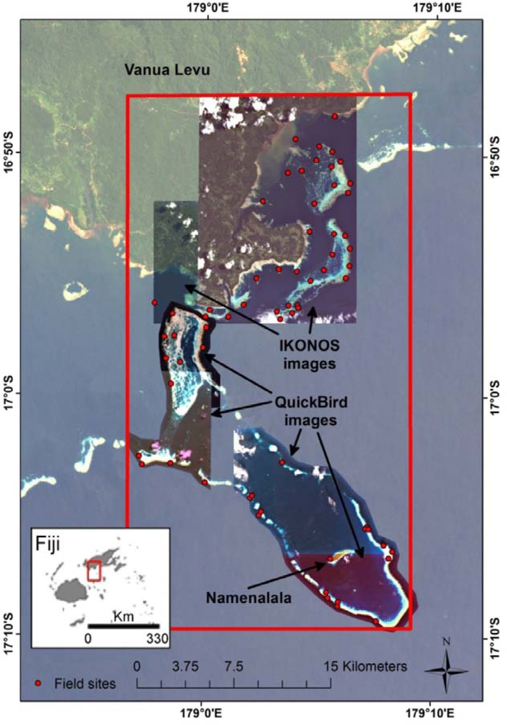 Our study investigates the ability to model and map four of these resilience indicators using high resolution satellite data and field observations. Specifically, we use field data to test the ability to map the following indicators: stress-tolerant coral taxa, coral diversity, herbivore biomass and coral recruitment (Table 1). We also include two other resilience indicators that complement those listed in Table 1, for which field data were available: (a) herbivore functional group richness, used in a recent study by Cheal et al.[48], as resilience may depend on having the full complement of ecological processes derived from different forms of herbivory [49–51], and (b) the cover of live coral and crustose coralline algae, promoted as an indicator within the Coral Health Index [52], both as an indicator of present-state algal-coral dynamics when coupled with macroalgal cover [53,54] and a proxy for the amount of substrate available for coral settlement following a mass bleaching event and, hence, related to coral recruitment potential [43–55]. We do not investigate those indicators for which data products are already available (historical temperature variability and nutrients), those that can be mapped with existing methods (sedimentation, physical impacts and macroalgae) or those for which we do not have spatially distributed field data (coral disease and fishing pressure). We adopt and expand upon methodology that we previously employed to map aspects of reef fish communities in Fiji [47], in which we used high-spatial resolution satellite imagery to create spatial data layers of environmental variables that inform models predicting response variables. The fine spatial resolution of the satellite data (≤4 m pixels covering more than 260 km2) enables mapping of the resilience indicators with a level of spatial detail meaningful for customary management systems in the Western Pacific and comparable to other maps of the area [47].
