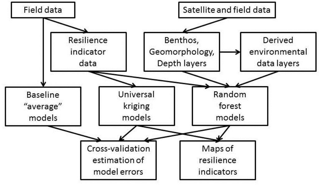 We assessed two possible modelling approaches (Random Forest and Kriging models) for mapping six indicators of coral reef resilience—stress-tolerant coral taxa, coral generic diversity, fish herbivore biomass, fish herbivore functional group richness, density of juvenile corals and the cover of live coral and crustose coralline algae—using field observations and high spatial resolution satellite imagery. All the maps, except the one showing coral diversity, constitute a better-than-random description of the spatial distribution of the resilience indicators and, as such, constitute a resource that enables incorporation of reef resilience into MPA network planning in the region.
