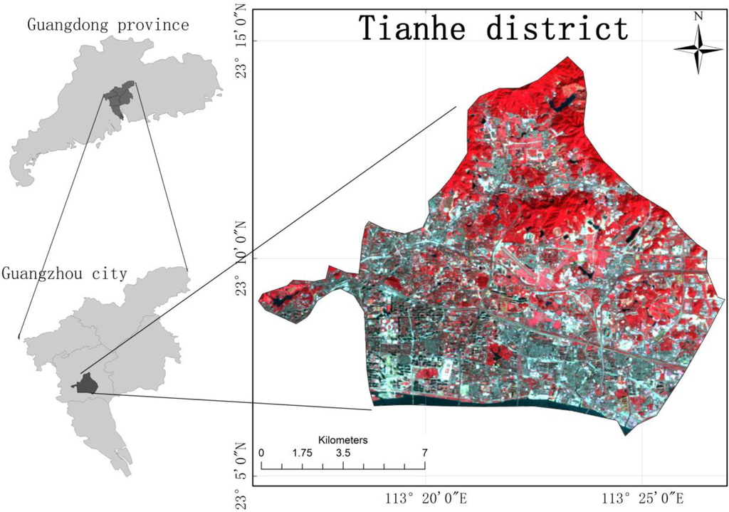 Guangzhou, the capital of the Guangdong province, is the political, economic, and cultural center of the Guangdong province and a transportation hub in southern China. Tianhe district (Figure 1) is a new Central Business District (CBD) of Guangzhou which covers 139 km2 with the population of 0.62 million in 2005. It is located in the north bank of Pearl River, east of Guangzhou city. It has a subtropical climate, which is strongly influenced by the Asian monsoon, with an average annual temperature between 21 °C and 23 °C, and an average precipitation from 1,600 to 2,600 mm.