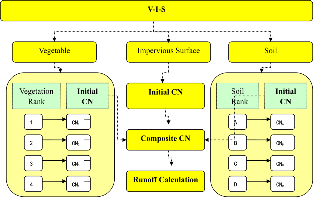 The SCS-CN model utilized in this study is to simulate surface runoff volume in the urban areas. Each pixel in the image is considered as a hydrologic response unit, and is decomposed into fractions of V-I-S. The composite CN of a pixel means the average CN of the whole pixel. This sub-pixel method of CN modeling is distinct from previous studies where each pixel is treated as a whole, i.e., per-pixel method (e.g., [39]).
