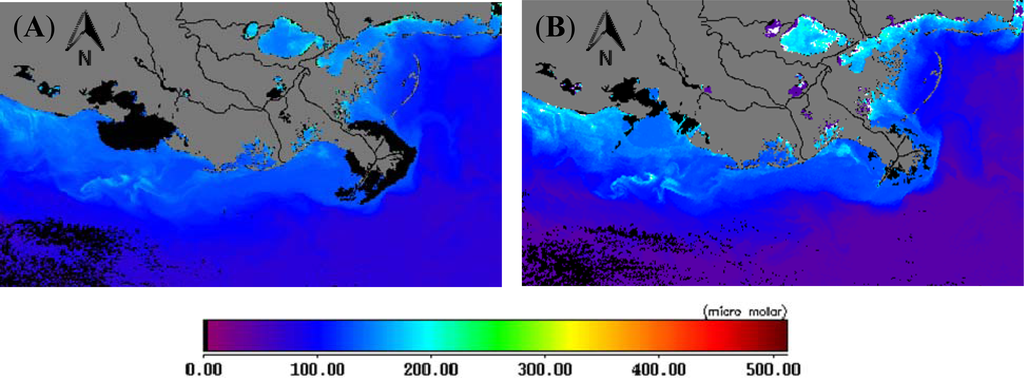 The influence of cold fronts on DOC concentration has been examined by comparing the occurrences of cold fronts and the time of DOC measurements. It appears that cold front passage increases DOC concentration resulting in less agreement between measured and satellite-derived DOC estimates, while the DOC field measurement corresponding to the time when no cold front occurred exhibited higher agreement. For example on 18 April 2008, for the station located at Tiger Shoal off the Atchafalaya Bay, the in situ DOC sampling coincided with the passage of a cold front. The measured DOC concentration was 218.50 μmol·C·L−1, while MODIS-derived DOC concentration was 125.84 μmol·C·L−1 (53% underestimation). In contrast, on 16 April 2008 with no cold front, in situ DOC concentration at a station close to the former station was 170.9 μmol·C·L−1, while MODIS-derived DOC concentration was 136.55 μmol·C·L−1 (17% underestimation). This increase in DOC concentration during cold fronts is likely due to resuspension of sediments [58] and the associated high DOC [59] pore waters in northern Gulf of Mexico shelf sediments.